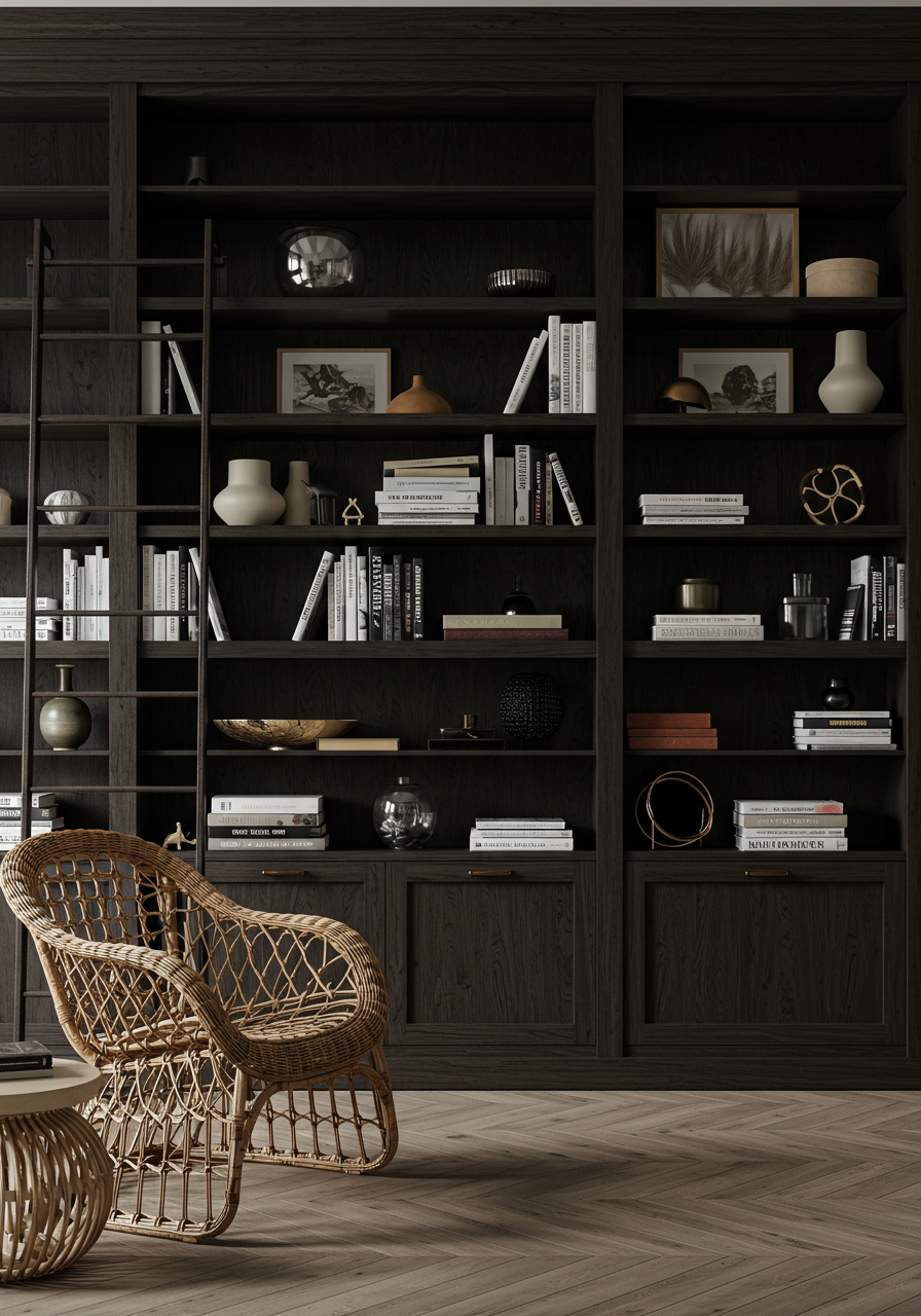 From the inky stained wood to the modern side chair and clean-lined ladder, this home library designed by Fiona Lynch is a gorgeous contemporary take on traditional design. You could fill it with books—or you could add in decor accents and accessories like vases and sculptures to break up the monotony of a wall of books. Or, color-coordinate your books. Not only will it feel more cohesive, but if you've got a lot of bright colors in your collection, they'll stand out even more.
