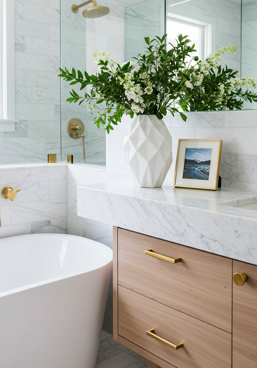 Adding a nice floral arrangement can beautify a whole room on it's own. The shapely vase, accompanying artwork, and unique rose gold faucet in this bathroom don't hurt either.