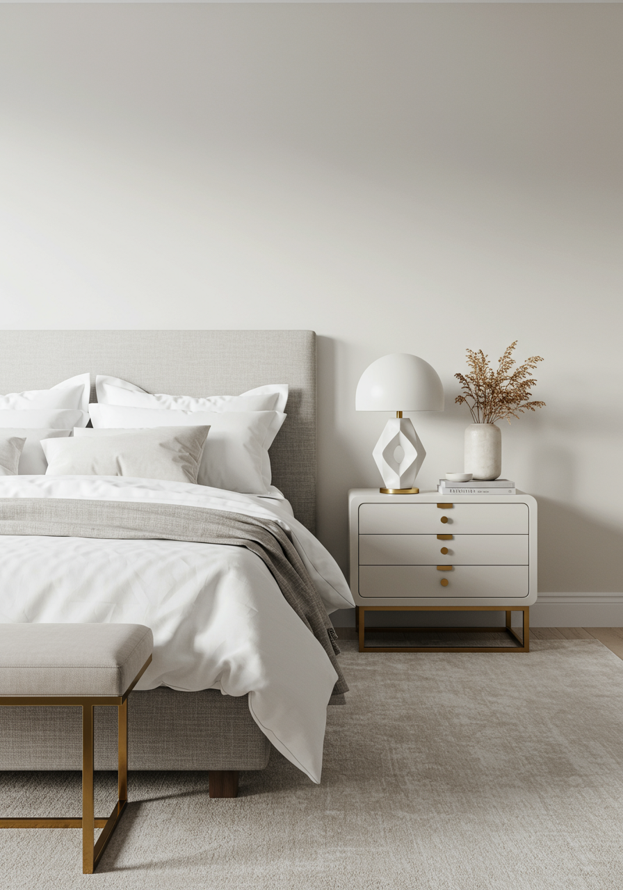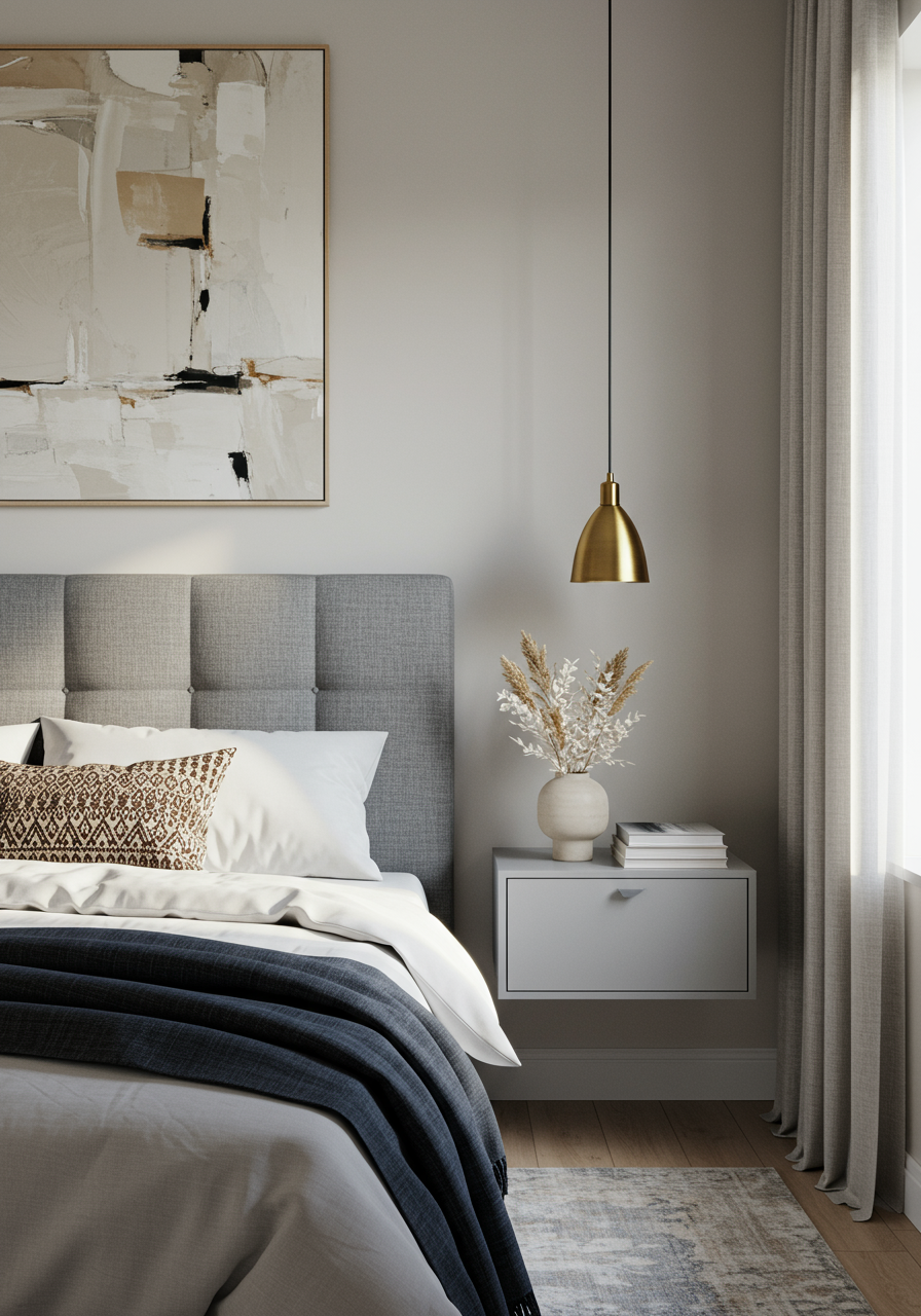 If there's anything that can single-handedly polish off a room, it's a light fixture. Case in point? That brass pendant light. It feels much more refined and sophisticated than a table lamp would and contrasts with the more traditional elements throughout the bedroom.