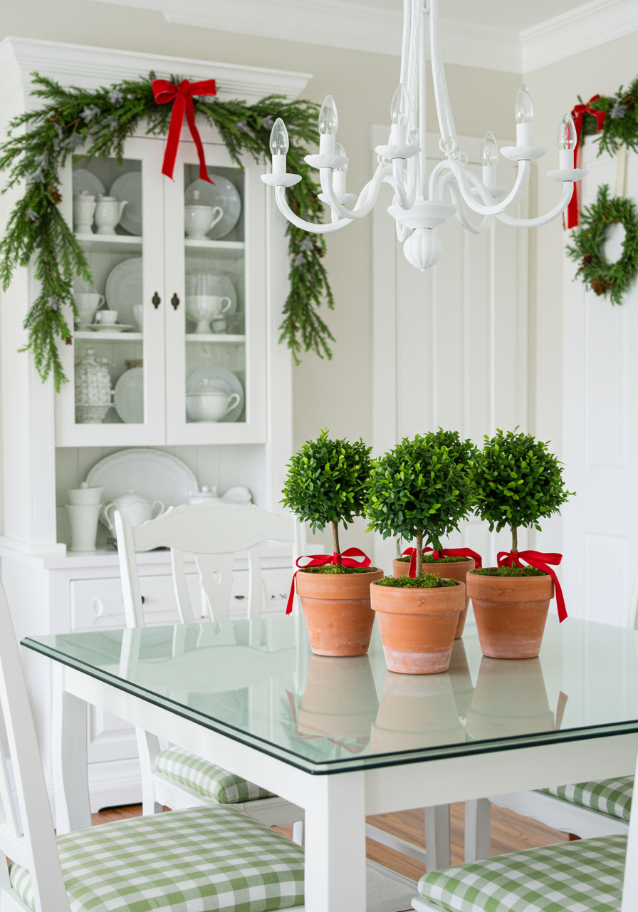 A chic Christmas tree alternative? A set of petite topiaries, grouped together and decked out in whimsical red ribbon. The look, which has the enduring appeal of Bunny Mellon’s preferred plants, comes to us courtesy of designer Sarah Bartholomew, who also outlined a display nook in a verdant garland for double the gorgeousness.Michael Sinclair