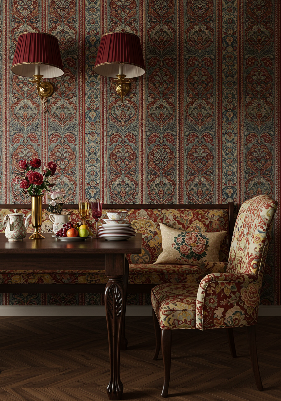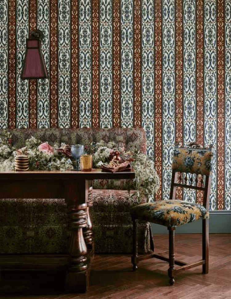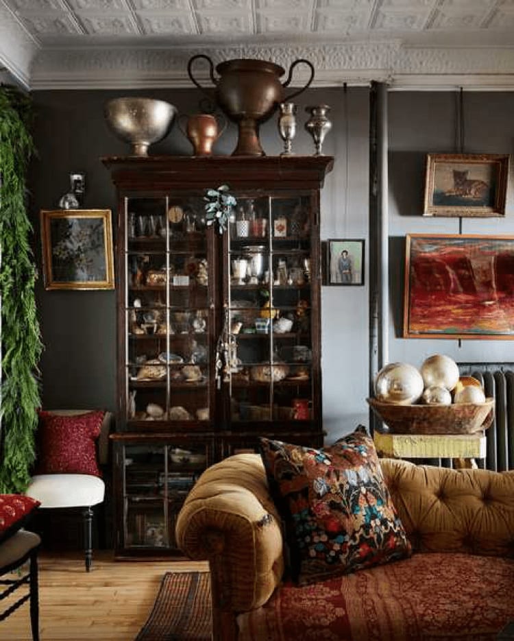 Holiday decorating doesn’t necessarily entail maximalism. In this quiet, atmospheric vignette, artist and designer John Derian simply hung an evergreen garland above a doorframe, packed a basket full of oversize metallic baubles, and hung a delicate paper sprig of mistletoe from the cabinet. Subtle, effortless—and timeless.Courtesy Sarah Bartholomew