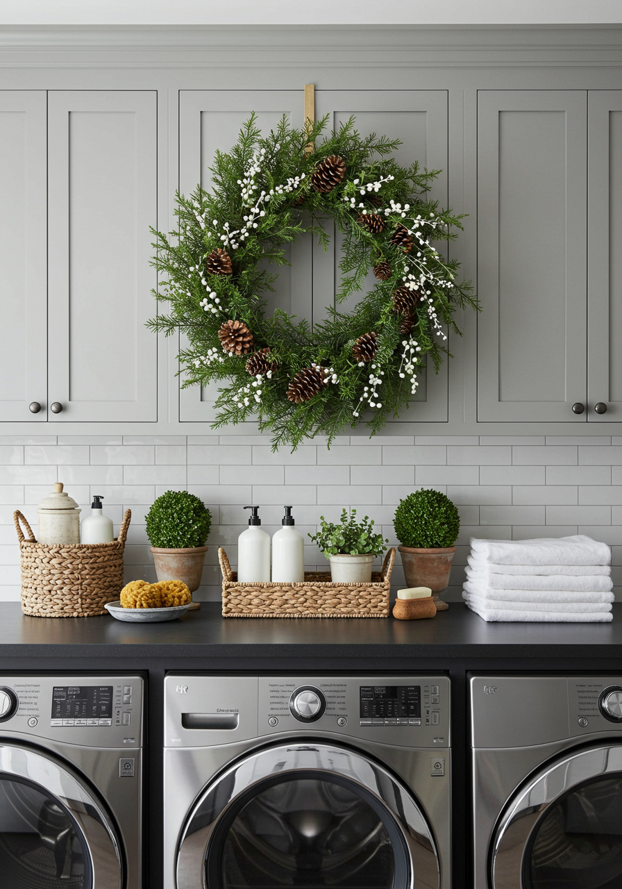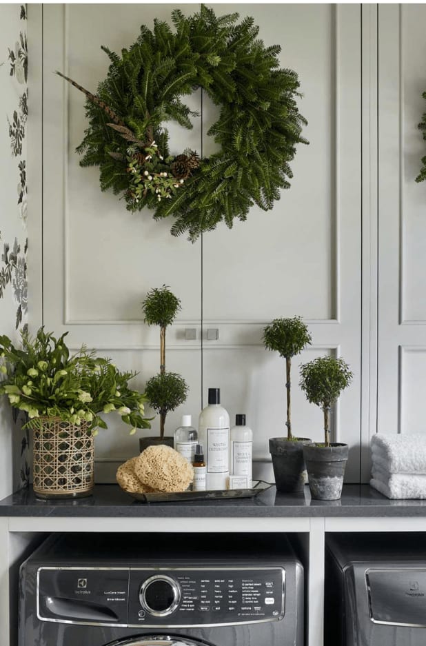 Anyone who wants to spruce up their laundry room should take a cue from Lauren Elaine Interiors. The Atlanta-based designer decked out this butler’s pantry with a lush green wreath and matching mini topiaries.