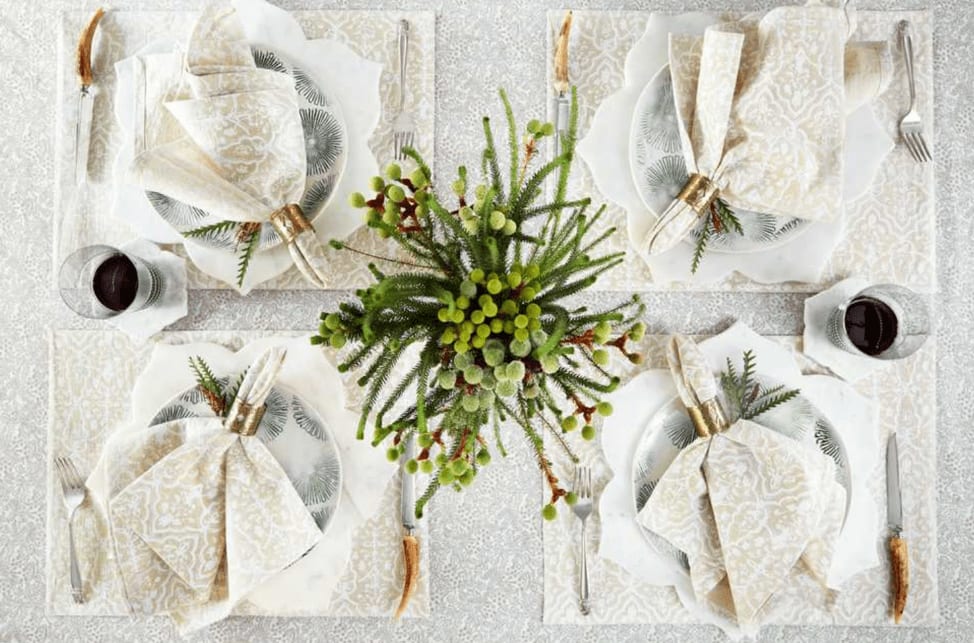Evergreens needn’t be only of the conifer variety. Just see the out-of-this-world holiday greenery in the London home of House of Hackney co-founders Frieda Gormley and Javvy M Royle. Here, for a stunning dining centerpiece, they used a variety of wild greens and tucked in quirky blooms, like pale pink anthurium, with holly berry sprigs for a fun nod to tradition. Get the look by using your own backyard as inspiration.Ariel Garneau