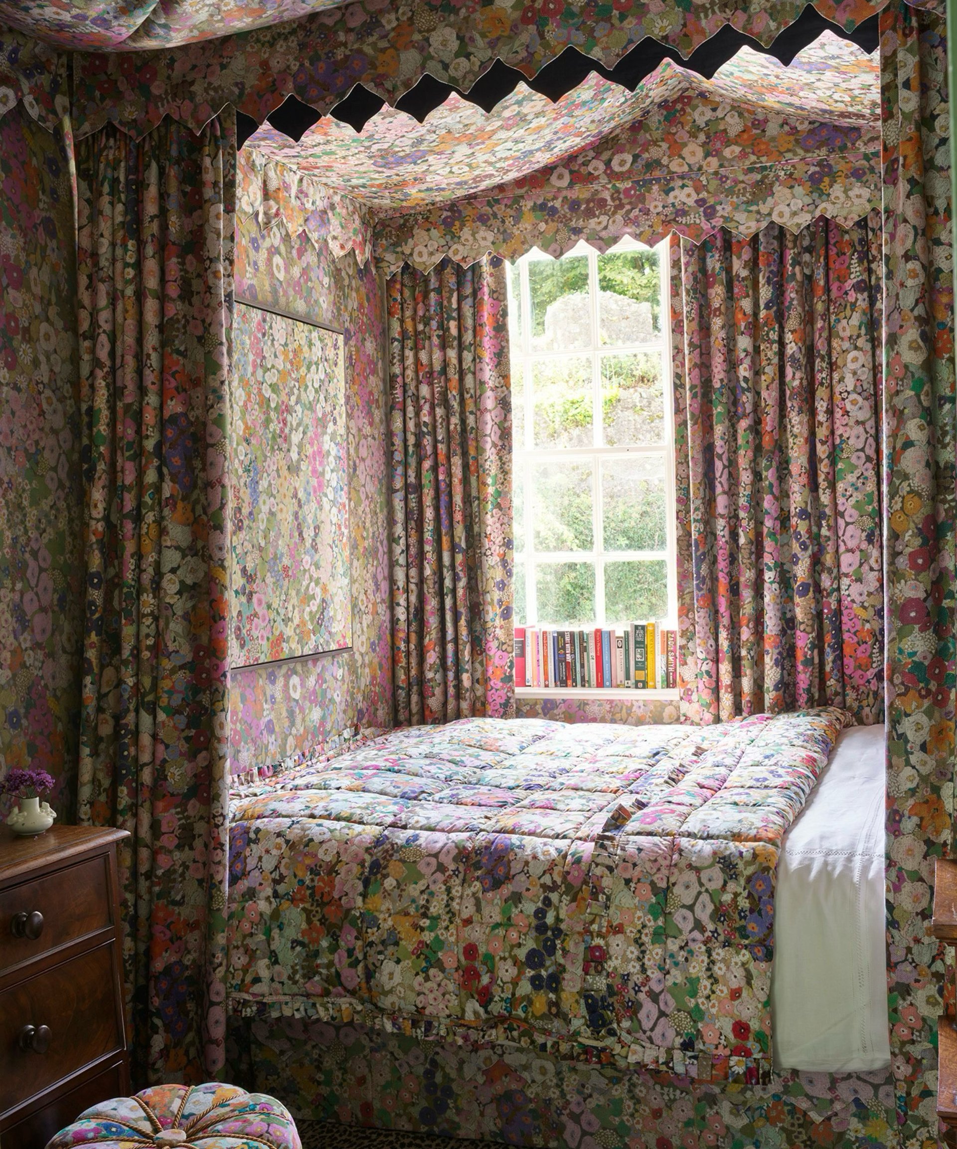 As shown in this elegant and cocooning bedroom by House of Hackney, their bold 'Hollyhocks' print has been matched throughout the room from the walls and bed linens to the curtains to establish a luxurious, plush look that feels both cozy and unique.