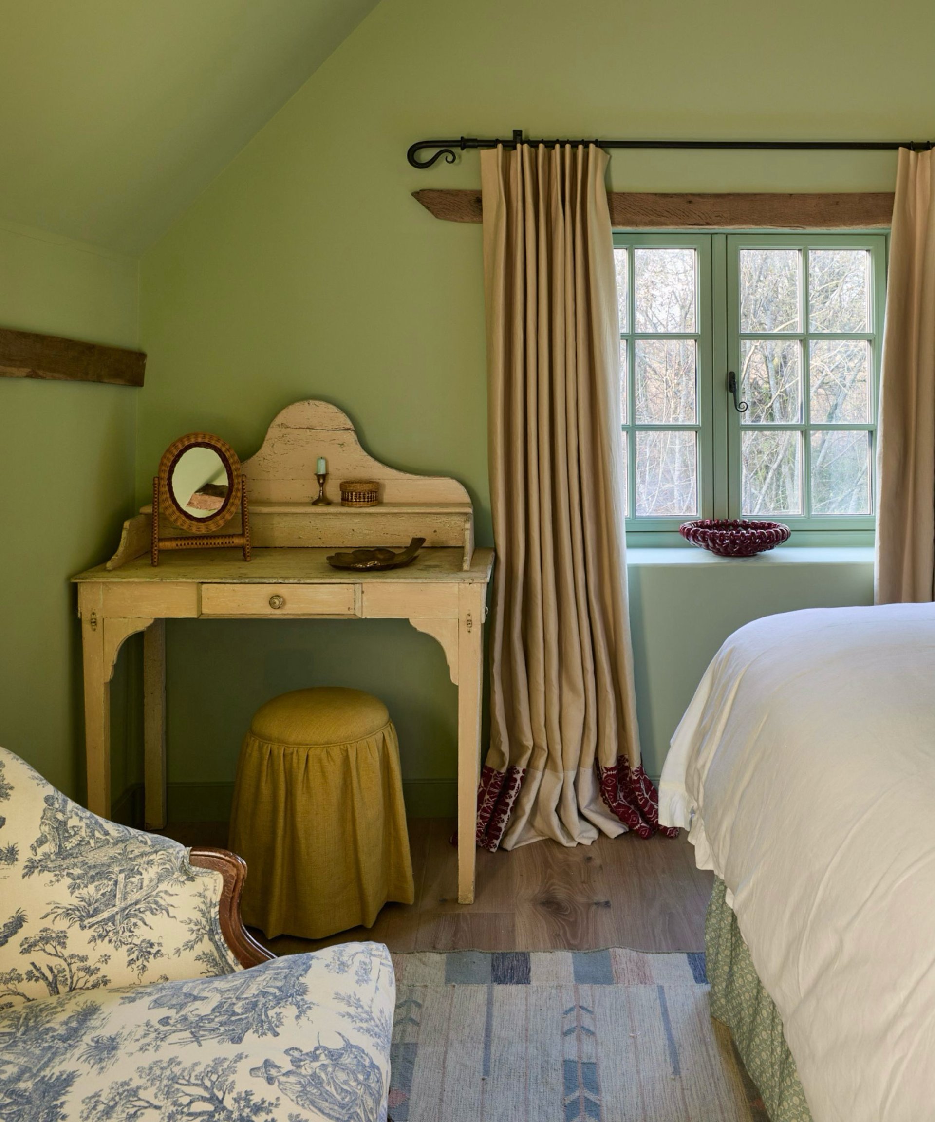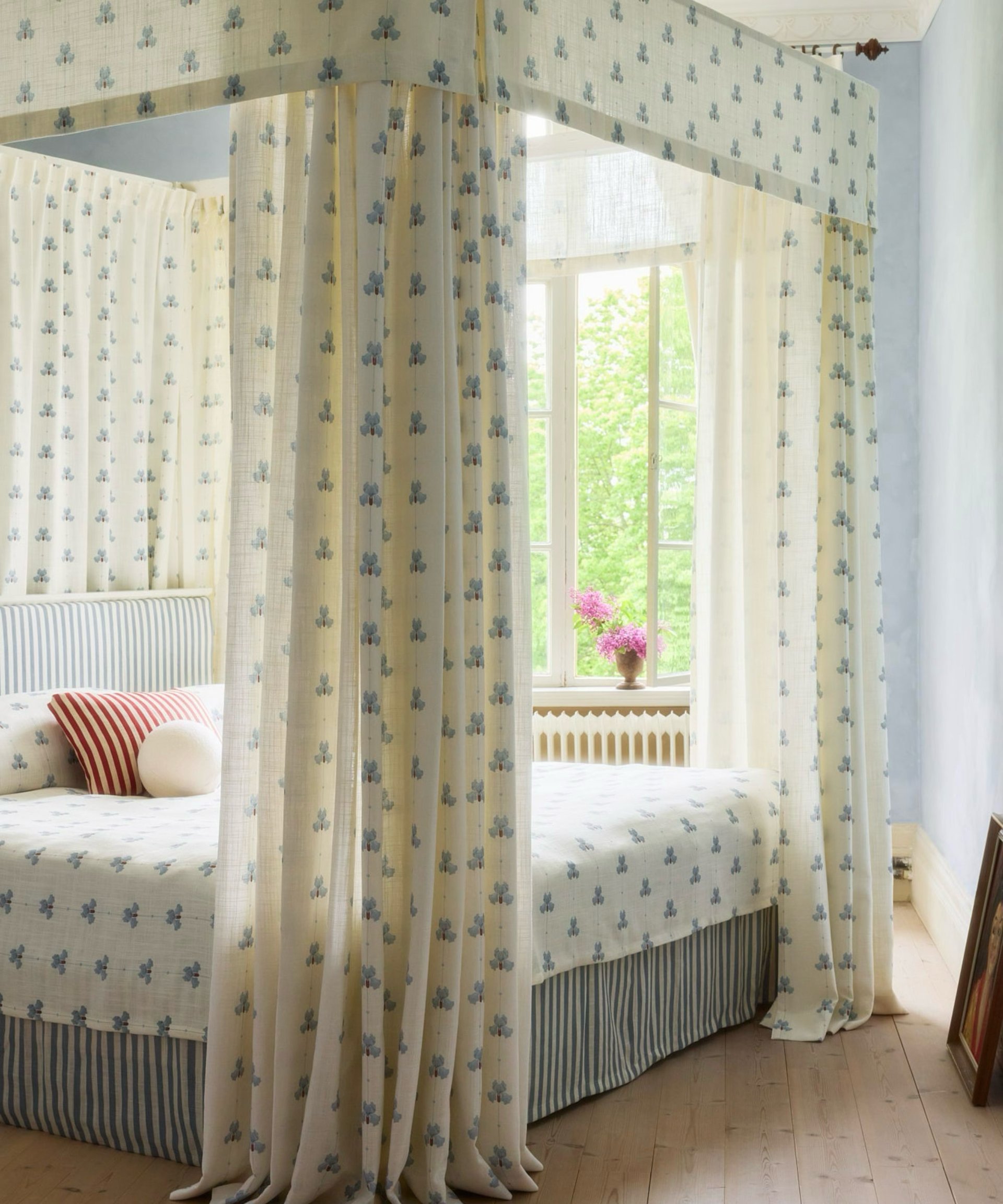 In this cottagecore style bedroom, the four-poster bed has been dressed with soft, sheer floral curtains. Adding a tactile element of texture to the room and helping to establish a tranquil and private sleep space, these curtains nod to a traditional canopy bed design but with a simpler and organic look.