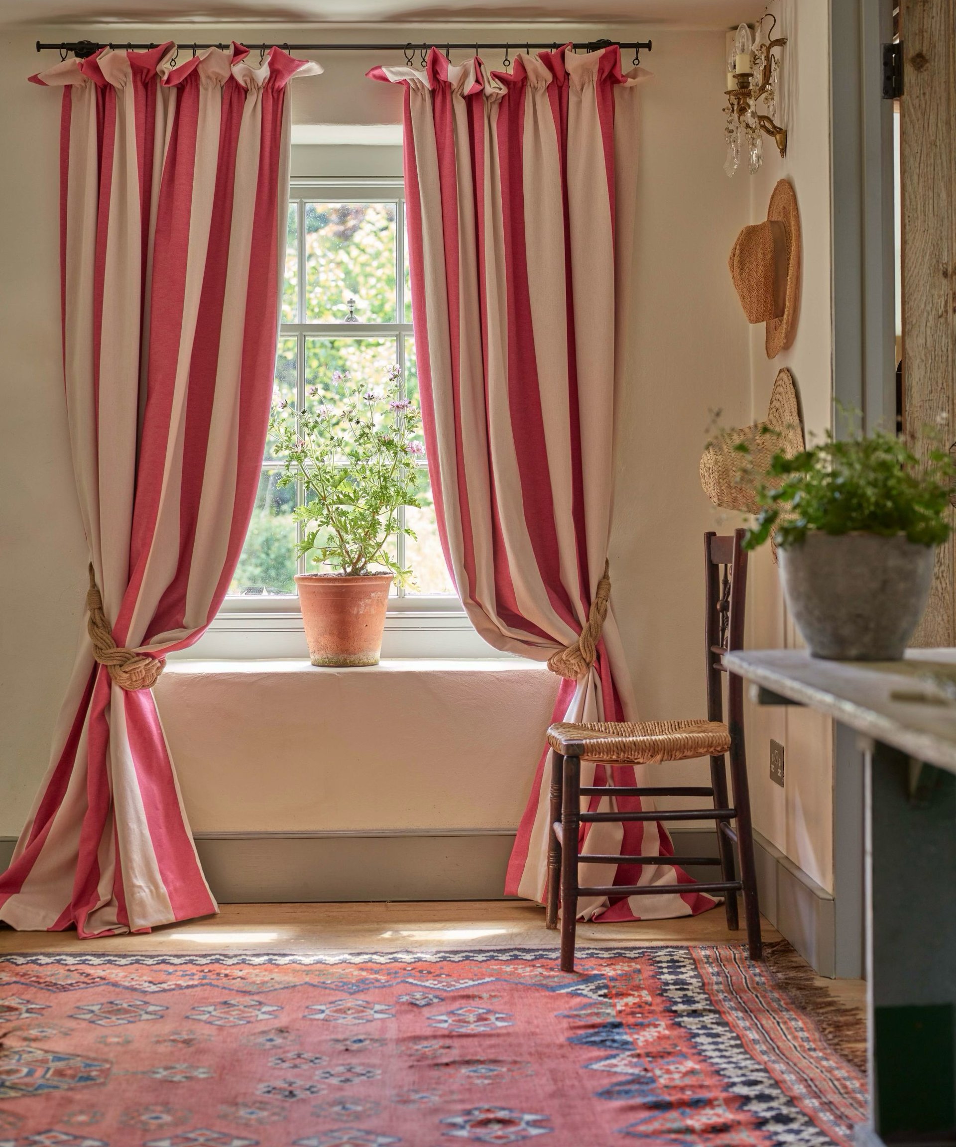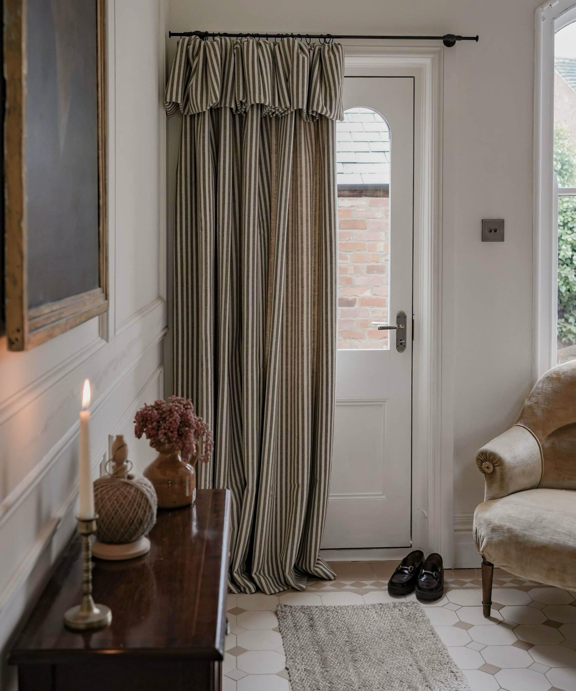 For rustic romance, consider a flop-over-frill at the top of your curtains, like this thermal front door curtain seen above by Tori Murphy, who adds: 'Curtains are more than just window coverings, they are a way to add texture, warmth, and personality to a room. Soft patterns such as classic stripes, small-scale geometrics, and checks that add character without overwhelming the space are perennial favorites.'