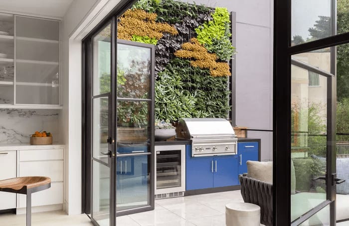 This outdoor kitchen from interior designer Lance Thomas of Thomas Guy Interiors is tucked onto the back wall of a spacious exterior patio and blends in perfectly with the outdoor space's gray and white palette and adjacent lounge space. Thomas recommends using weather-friendly materials and fabrics in an outdoor space for durability, such as eco-friendly rattan. And he recommends incorporating greenery such as banana leaf trees and orchids "to add a touch of nature," adding that "high-design planters can be a creative way to show off one’s own personal style."