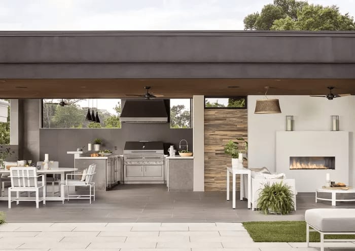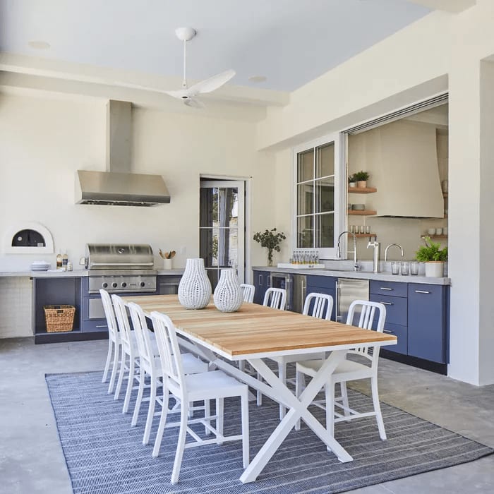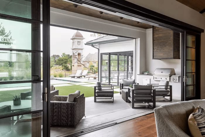 This spacious outdoor kitchen from Mel Bean Interiors is connected to the outdoors on one side and to the indoor kitchen on the other, separated by sliding windows, and features an outdoor living room space on the other side of the patio with a sofa and a fireplace. “It is important that the design is functional for the family," says Bean, who recommends "prioritizing hardworking fabrics and an open-concept layout that connects to the outdoors for family—kids and dogs included—to move around."