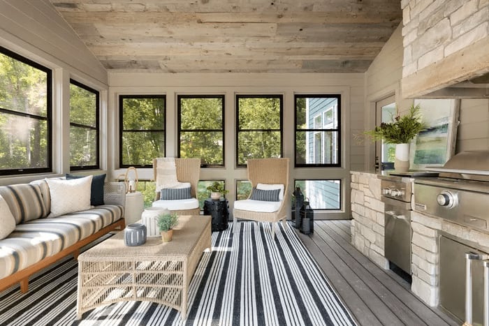 Depending on the climate where you live, a fully outdoor kitchen isn't always desirable or realistic. This semi-outdoor kitchen from Martha O'Hara Interiors is located on the back screened-in porch of a Prior Lake, Minnesota bungalow that protects it from the elements and keeps cooks and diners safe from the bugs.