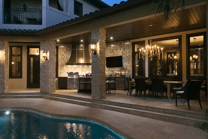 If you live in a state like Florida, you can invest in an outdoor kitchen knowing that it will get year-round use. This formal Florida outdoor kitchen and dining space from Lisa Gilmore Design is fully equipped and lit for poolside cooking and dining thanks to built-in lighting on the ceiling, the cooking and prep spaces, and a giant chandelier over the dining table.