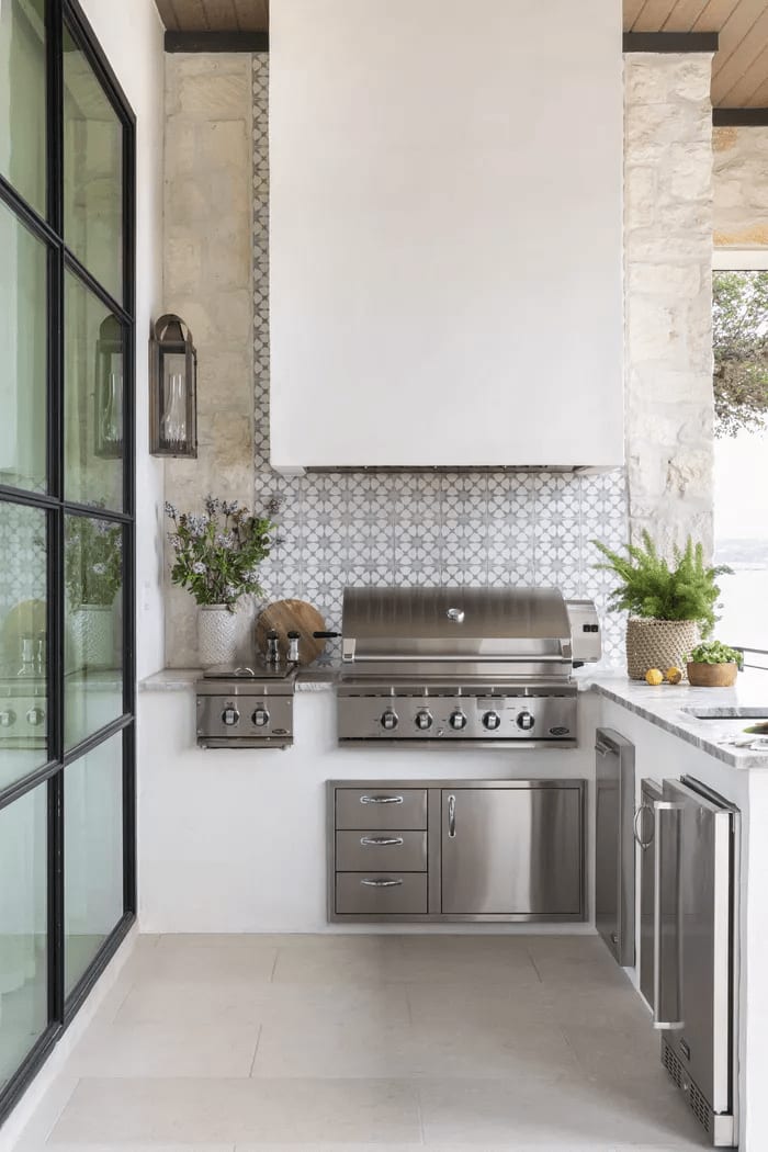 This L-shaped outdoor kitchen from Marie Flanigan Interiors has stainless steel appliances and a pretty patterned tile backsplash that makes it feel as put together as an inside space. An oversized statement hood vent helps to whisk away smoke from the grill and adds dimension to the outdoor space.
