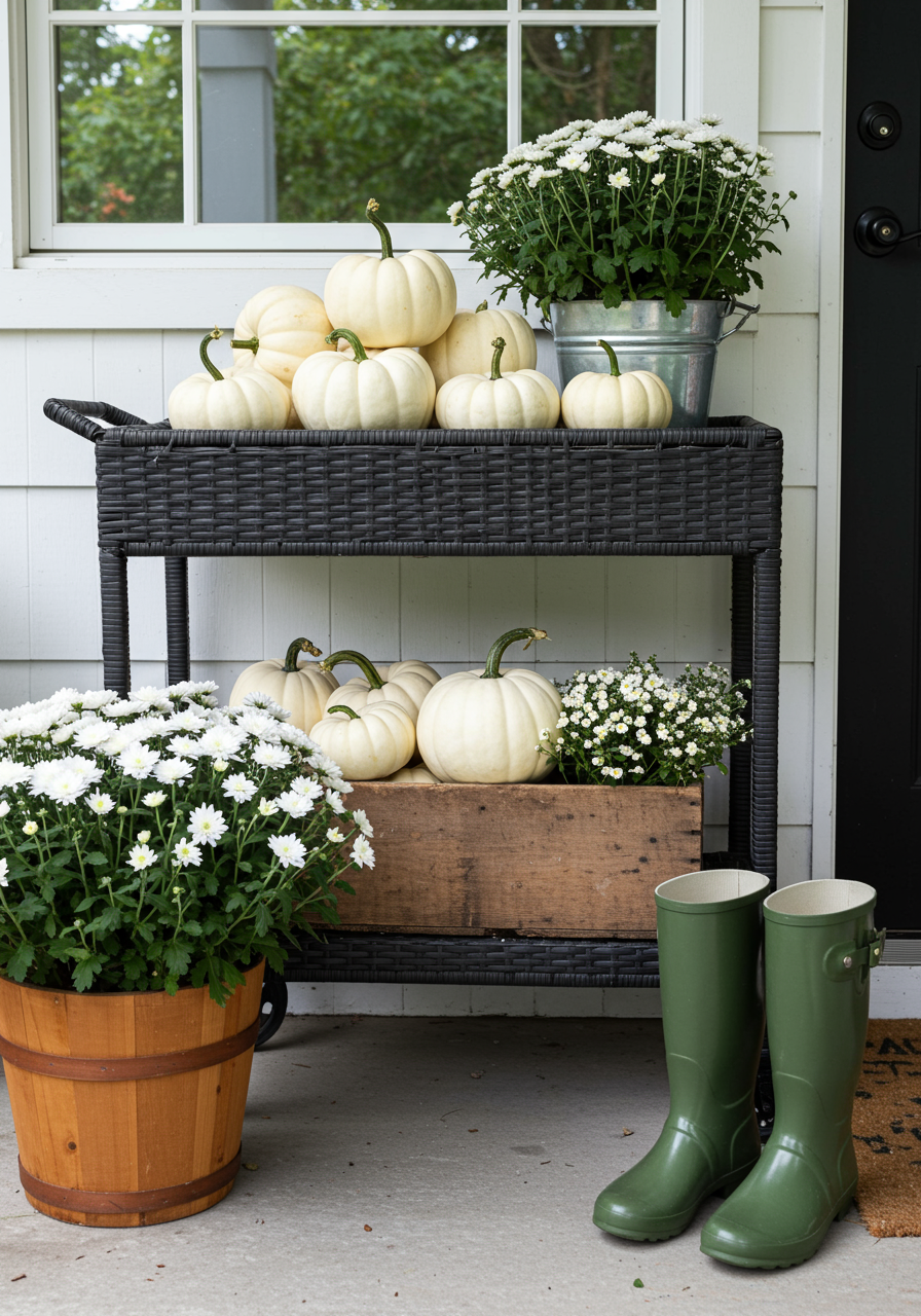 Give your outdoor bar cart more time to shine this fall by stashing pumpkins and gourds on each shelf. Add more flair by interspersing a bit of greenery.