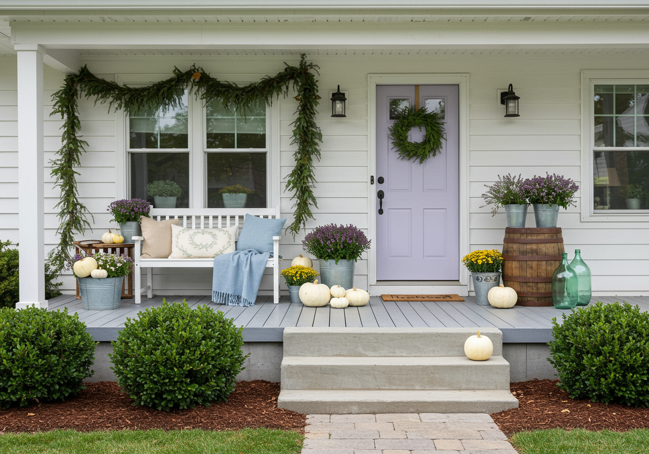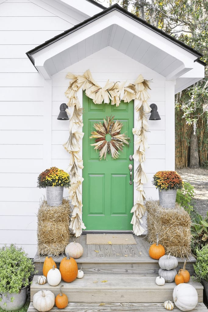 Drape a garland (this one is made from natural grapevine with seeded eucalyptus, olive branches, and preserved pink berries wired into it) over the porch window. Accent with white pumpkins and olive buckets.