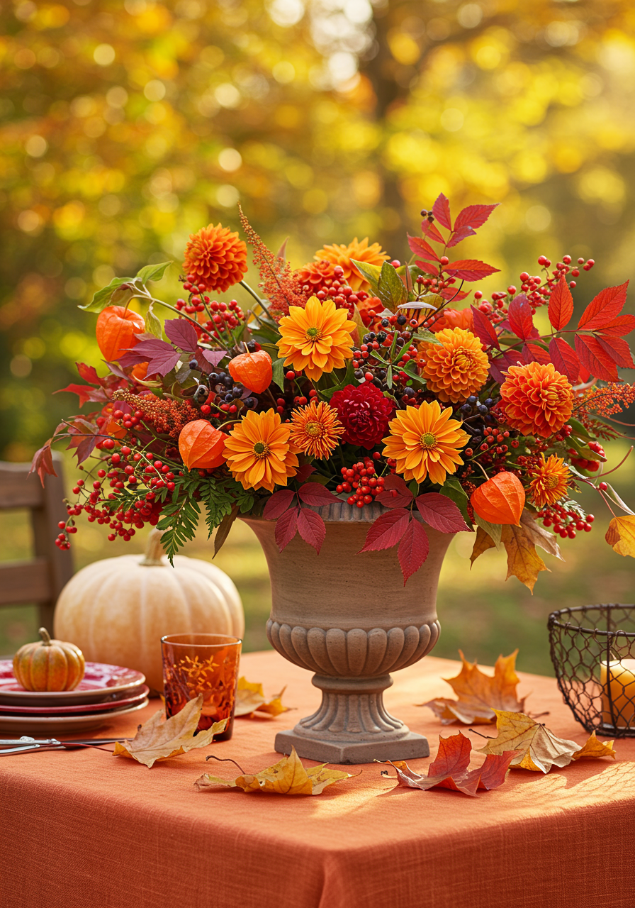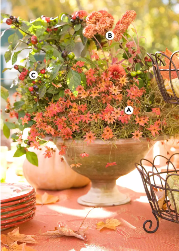 An airy mass of long-blooming coreopsis 'Mango Punch' combines with matching chrysanthemums and a few berried spikes of ornamental black pepper in a footed urn fall planter. Mango Punch' coreopsis, Chrysanthemum, Ornamental black pepper