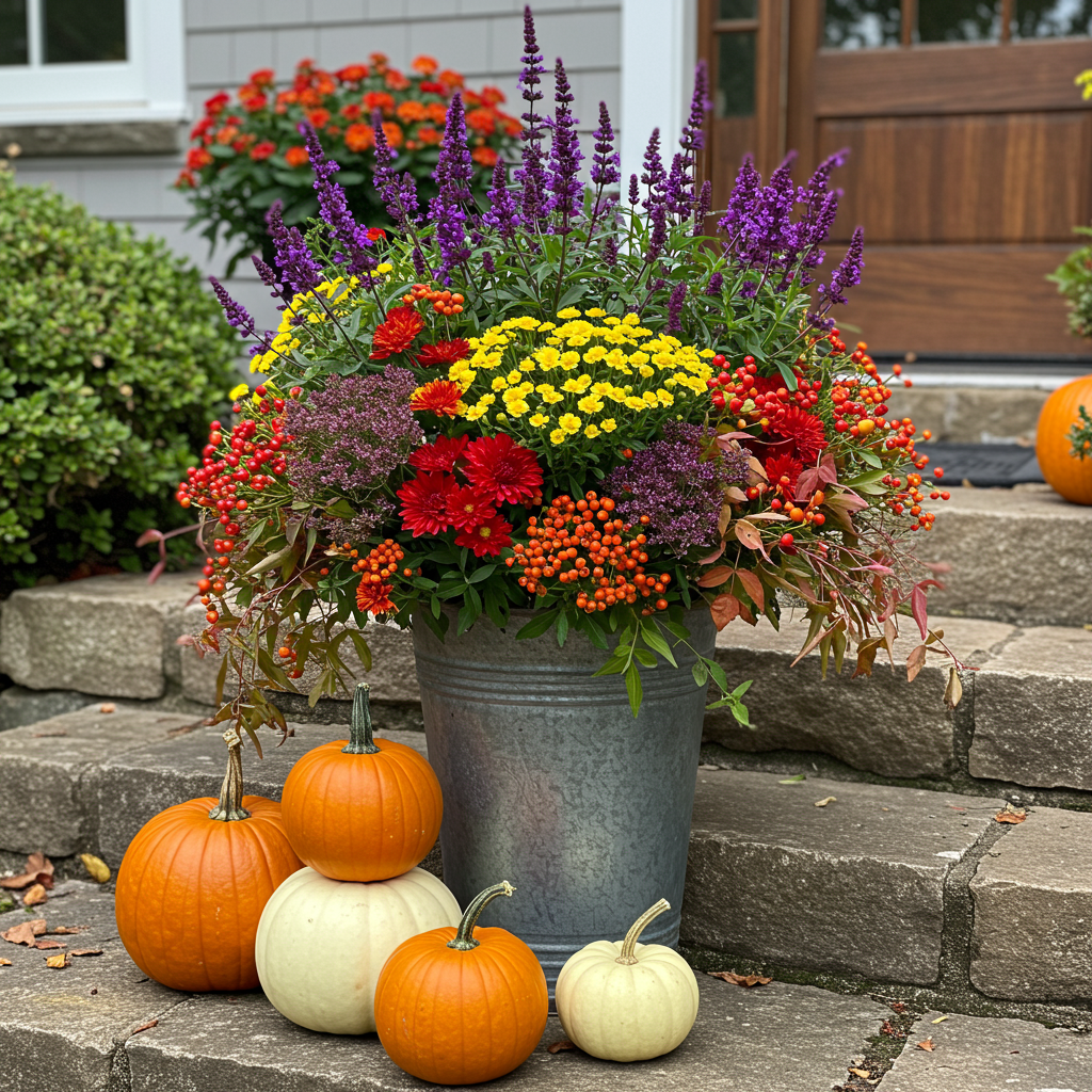 Warm and colorful using plants that can be replanted, kale and mums making this an explosive arrangement for the front door. Two would be even better