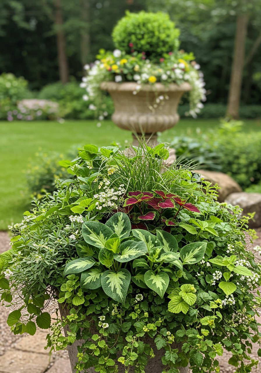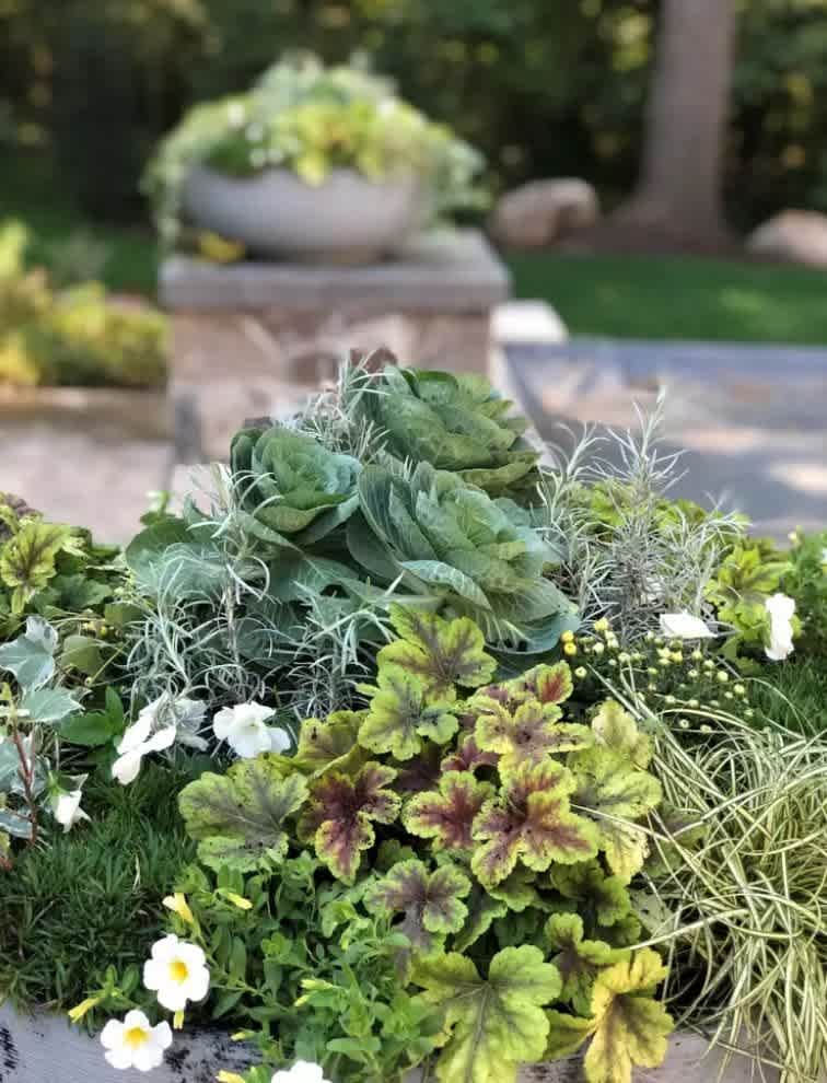 If orange and purple aren't your thing, try this all-green design. Here, a 30-inch low bowl is filled with flowering crane kale (a long-stemmed variety) and 'Icicles' licorice plant in the center. Clusters of white mums, white calibrachoas, 'Ice Dance' sedges, variegated English ivy and 'Gold Zebra' coral bells repeat four times around the circumference
