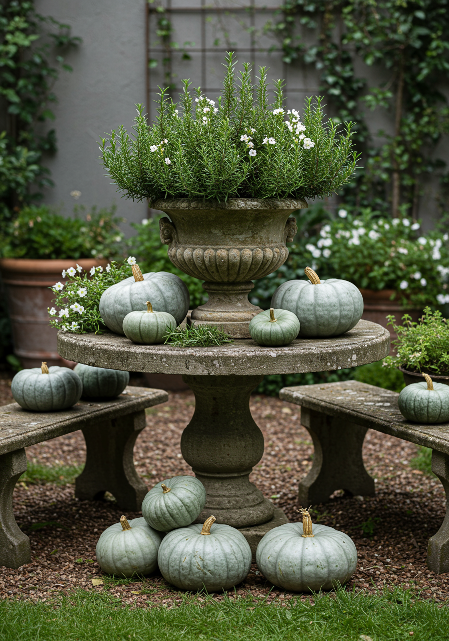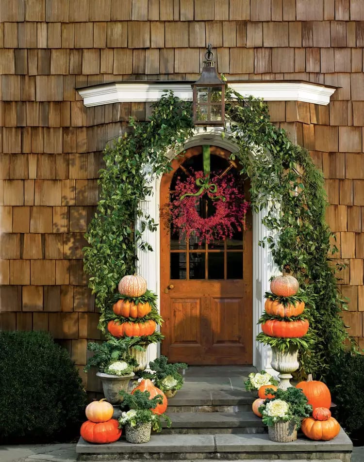 Pumpkins look great in clusters, but have you ever thought of going vertical? If you're looking to make a statement, use height for a dramatic effect. Stack pumpkins from largest to smallest, sandwiching greenery between each layer. Pumpkin topiaries atop a stone vessel make for eye-catching outdoor fall decor.