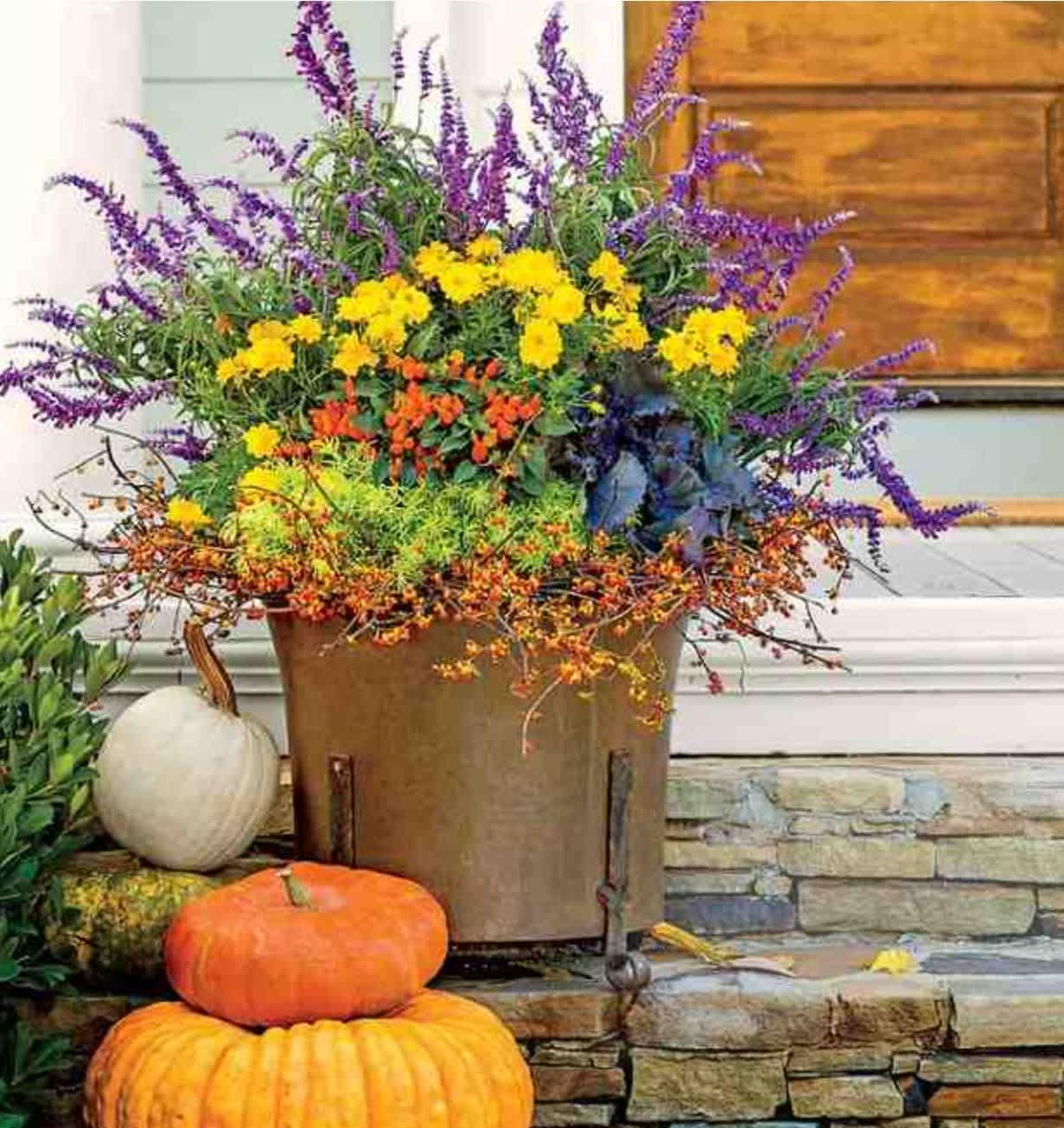 Fall is the best time of year! Flower options for planters and arrangements are bold, vibrant and ORANGE. Pumpkins are ORANGE. I love orange as an accent color, but prefer more subtle colors for my fall arrangements. Today pumpkins come in an array of hues from soft coral to dark green which gives us so many options to use when decorating. Even better, now there is ornamental kale or cabbage to add to the mix. Below read on to see some great options in flowers, plants and gourds to decorate with this Fall.