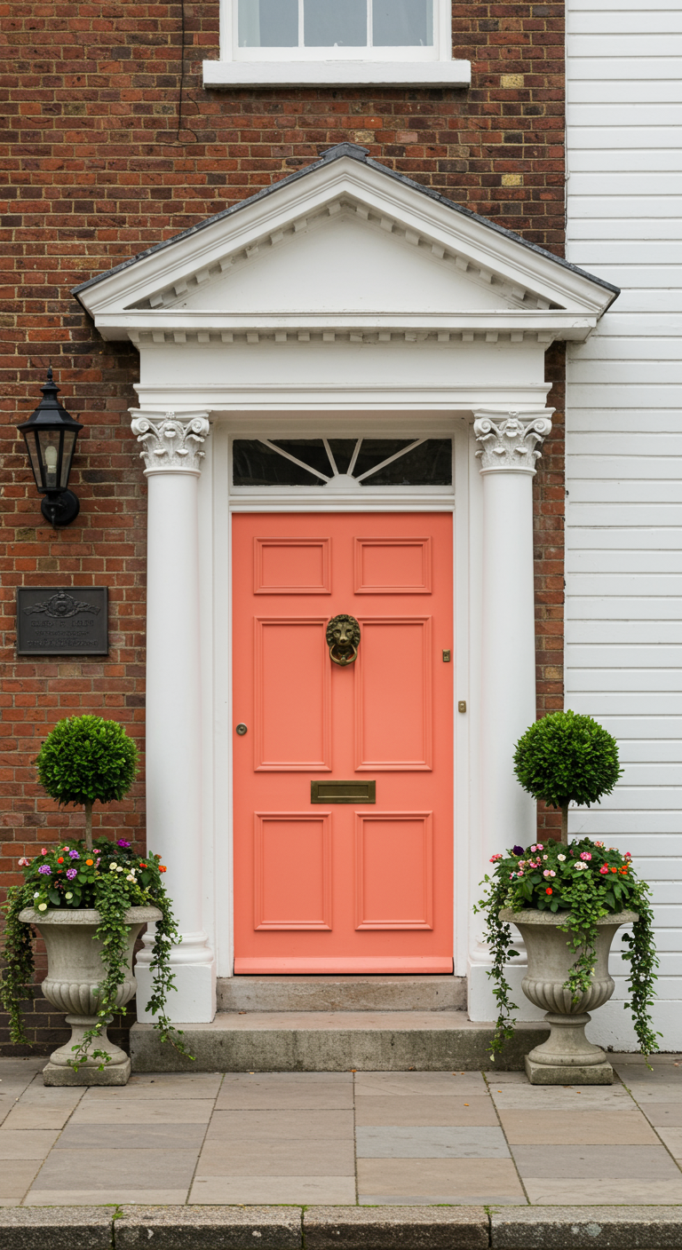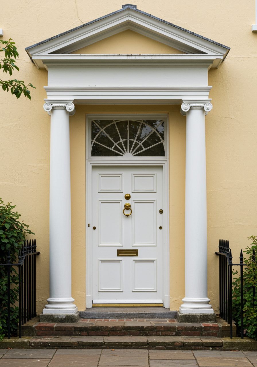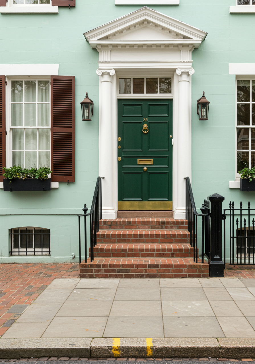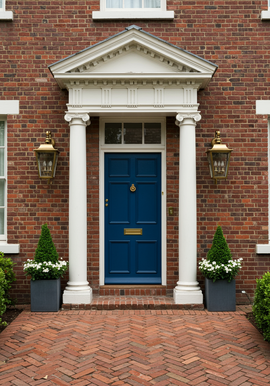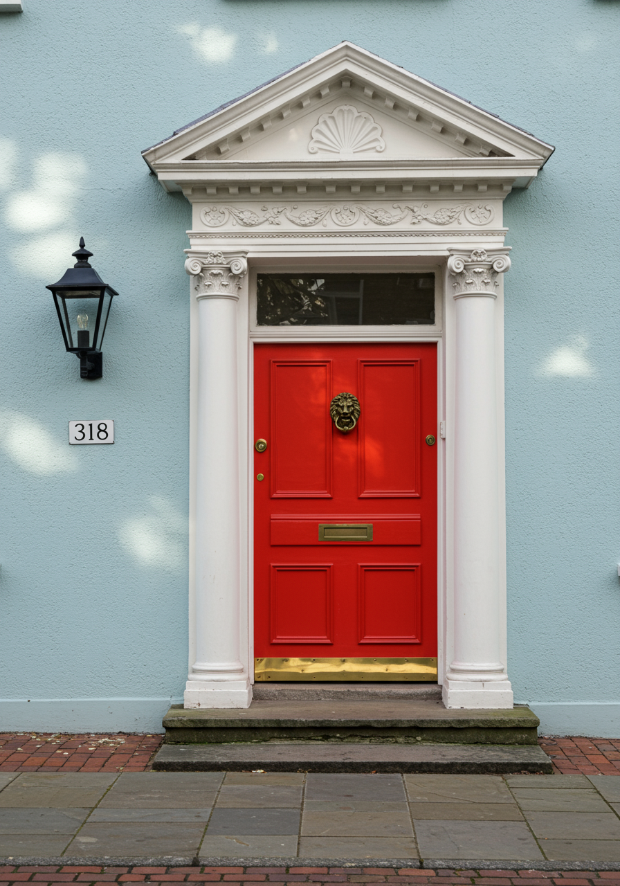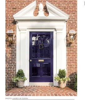 This rich purple is best for Georgian architecture. These houses' roots go back to a style popular during the reigns of four British kings named George. This paint color is a stately shade of purple and a nod to your home's royal connections. For contrast, leave the trim light. Break up the dark eggplant door and red-brick exterior with white on the pediment and pilasters.