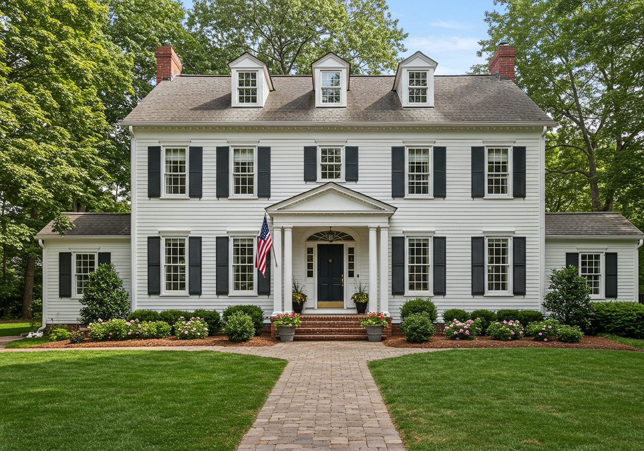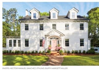 This pale pink is best on a blank canvas. This ballet pink takes center stage in this historical colonial-style home without competing with shutters. Bursts of pink flowers add to the sweetness without feeling too precious. Simple landscaping supports this focal feature with a minimalist approach.