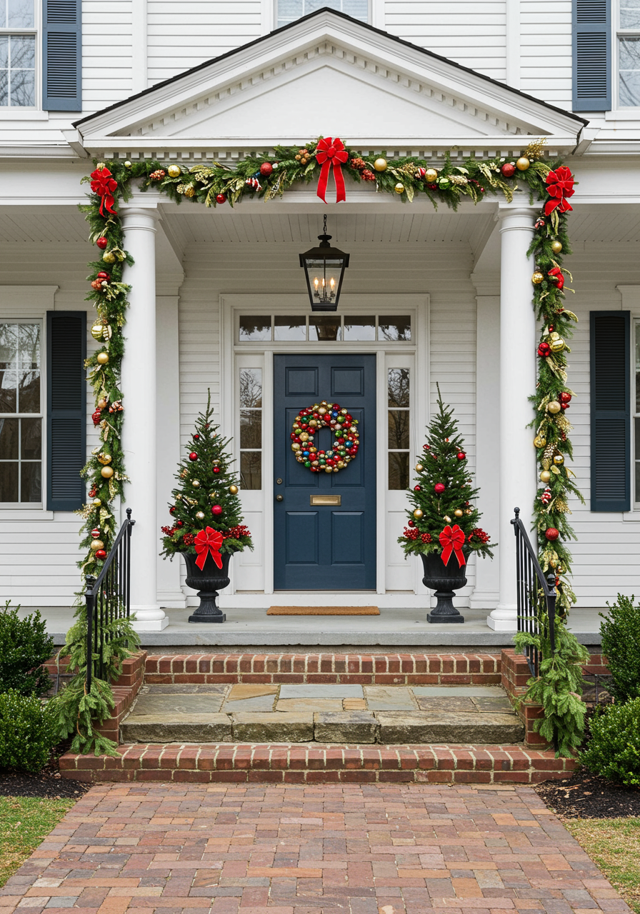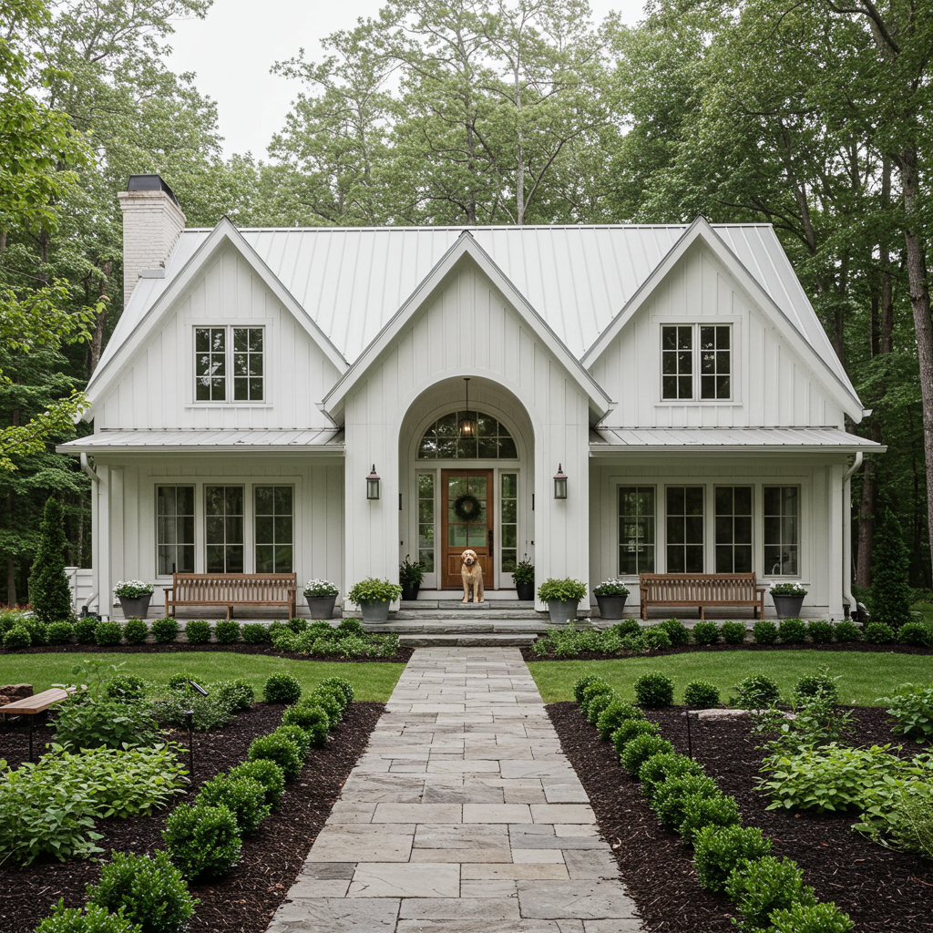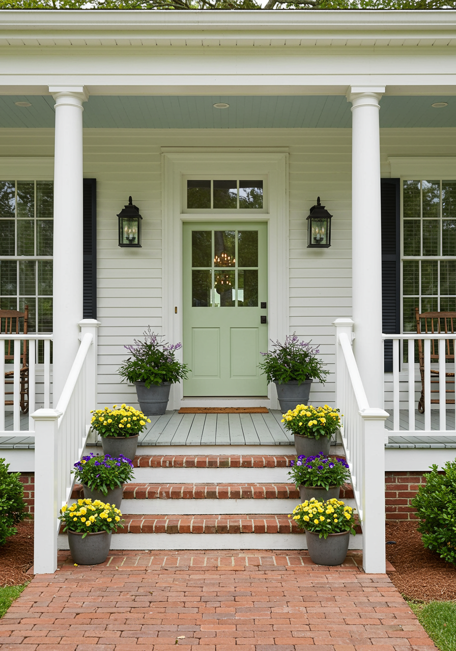 Create a welcoming entrance with an expansive terrace and a front door with a custom coat of rural green. This moss-green paint color pairs well with the house's siding and alcove in varying shades of white. Keep the landscaping neutral to complement this natural setting.