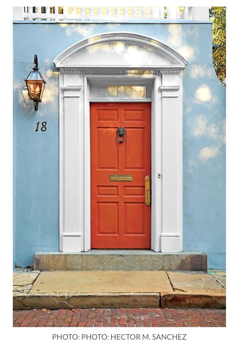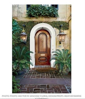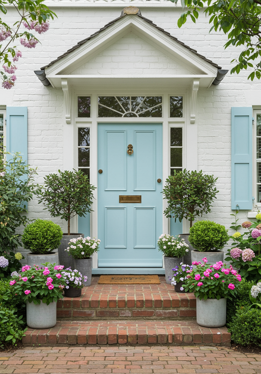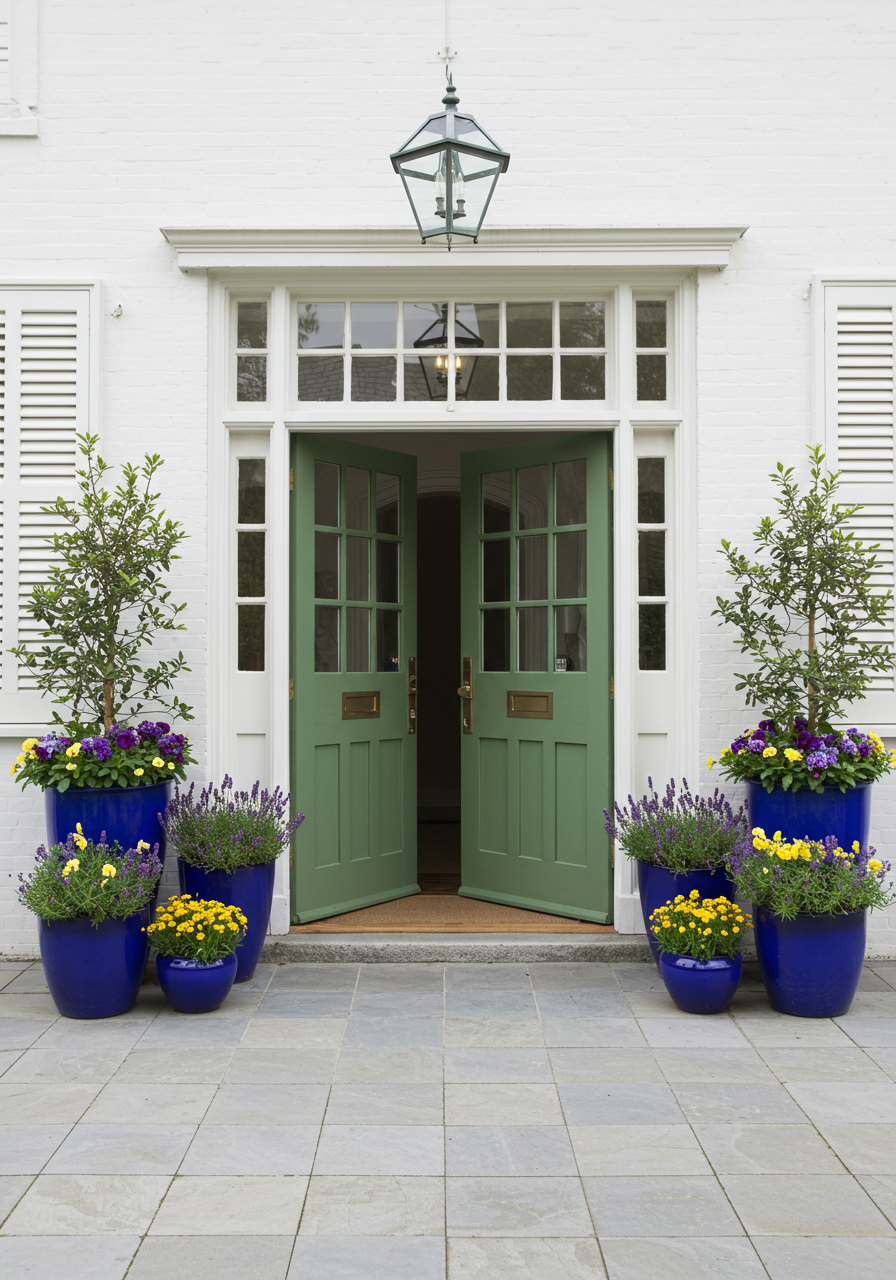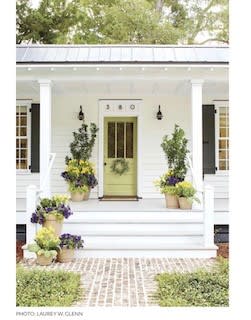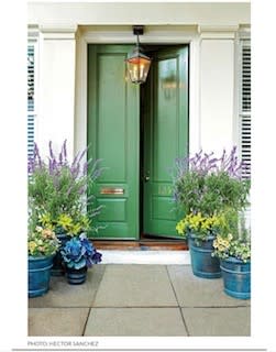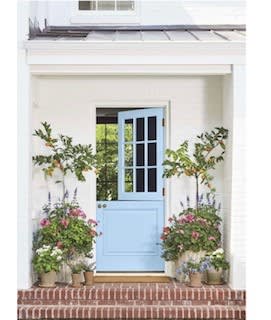 This cheerful blue looks good anywhere, especially on a white exterior or lighthearted Dutch door. It promises an instant smile from neighbors as well as curious house hunters. As a complementary balance, double up on pots. Keep the plantings equally loose and casual with baskets and mossy terra-cotta containers.