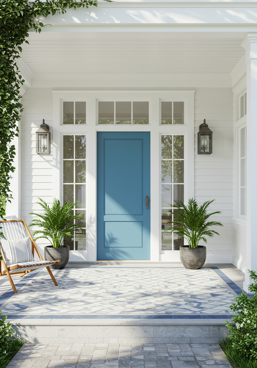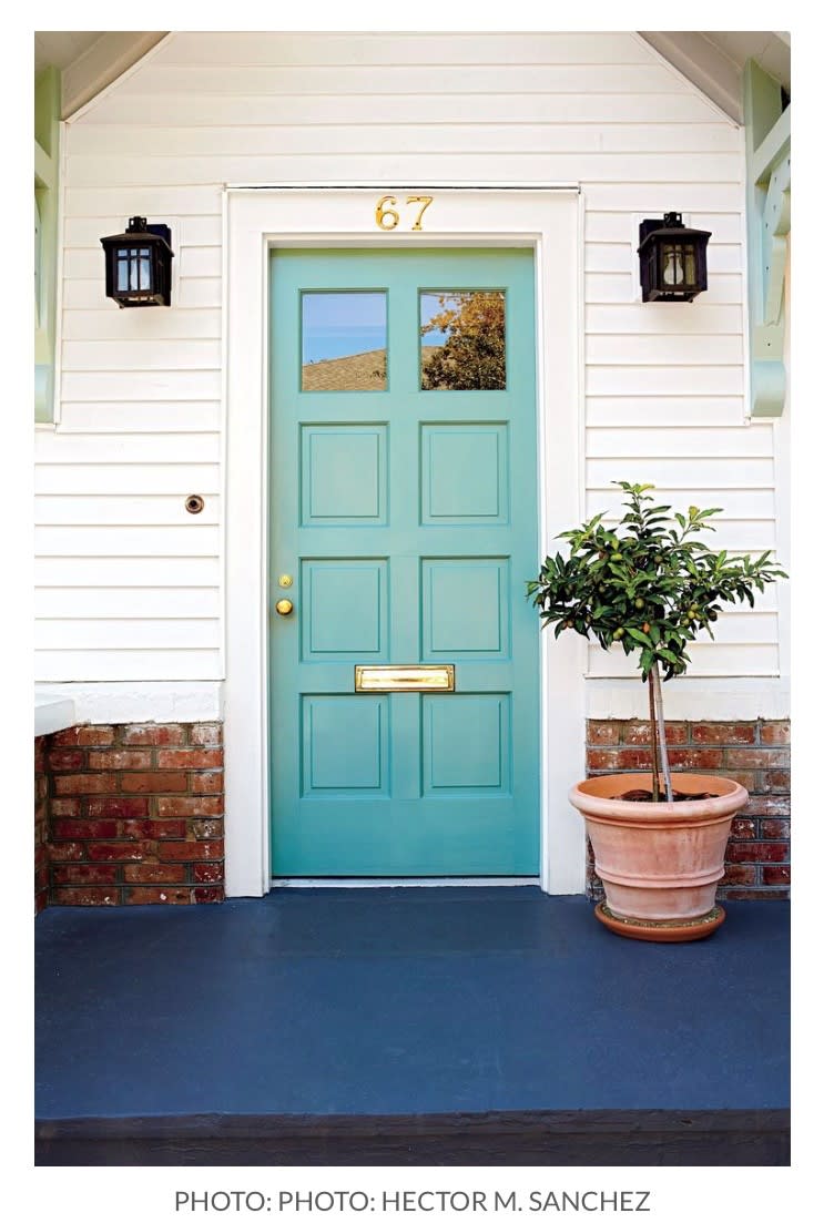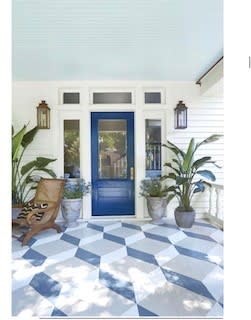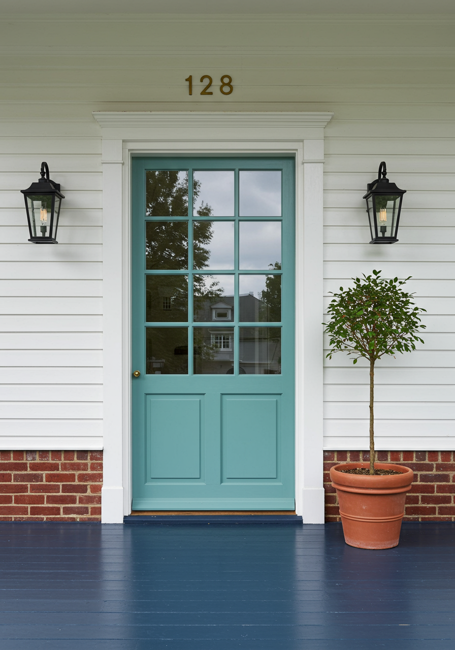 This saturated shade is best for craftsman-style homes. Their blocky millwork and deep porches were historically associated with muted earth tones. Consider a new approach with a shot of cobalt to brighten your bungalow. For a modern update, stencil the floor. You can paint a tonal geometric pattern across your front to offset the door's deep shade.