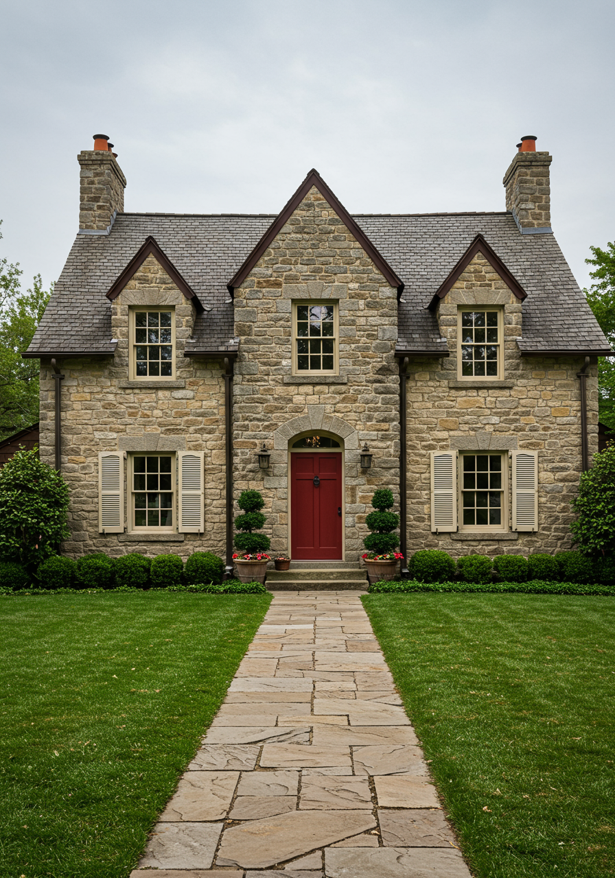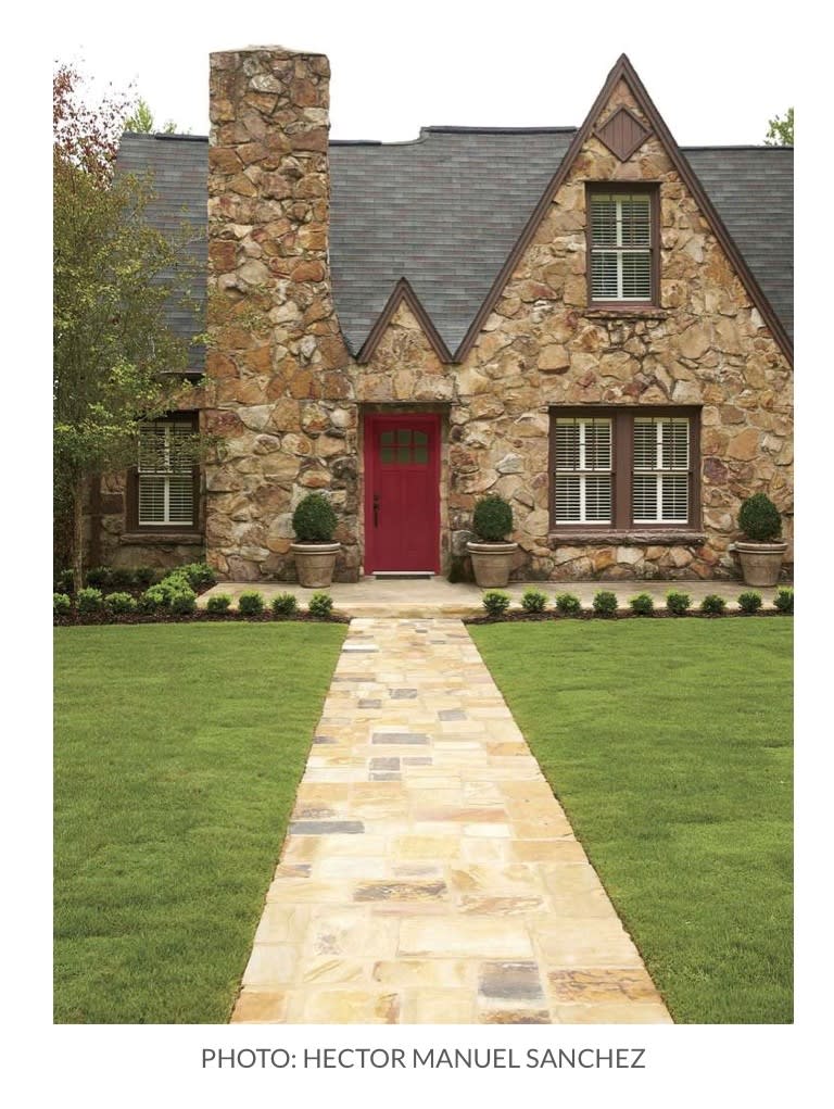 This traditional red is best for Tudors. Whether stone or stucco, big or small, these homes have a naturally imposing attitude. A welcoming door, lifted from the pages of a storybook, adds harmony to the house. Skip delicate flowers around the entryway, and pick shapely boxwoods for effortless impact. Trim for a crisp look, or surround them with dark grays for a romantic, moody look.
