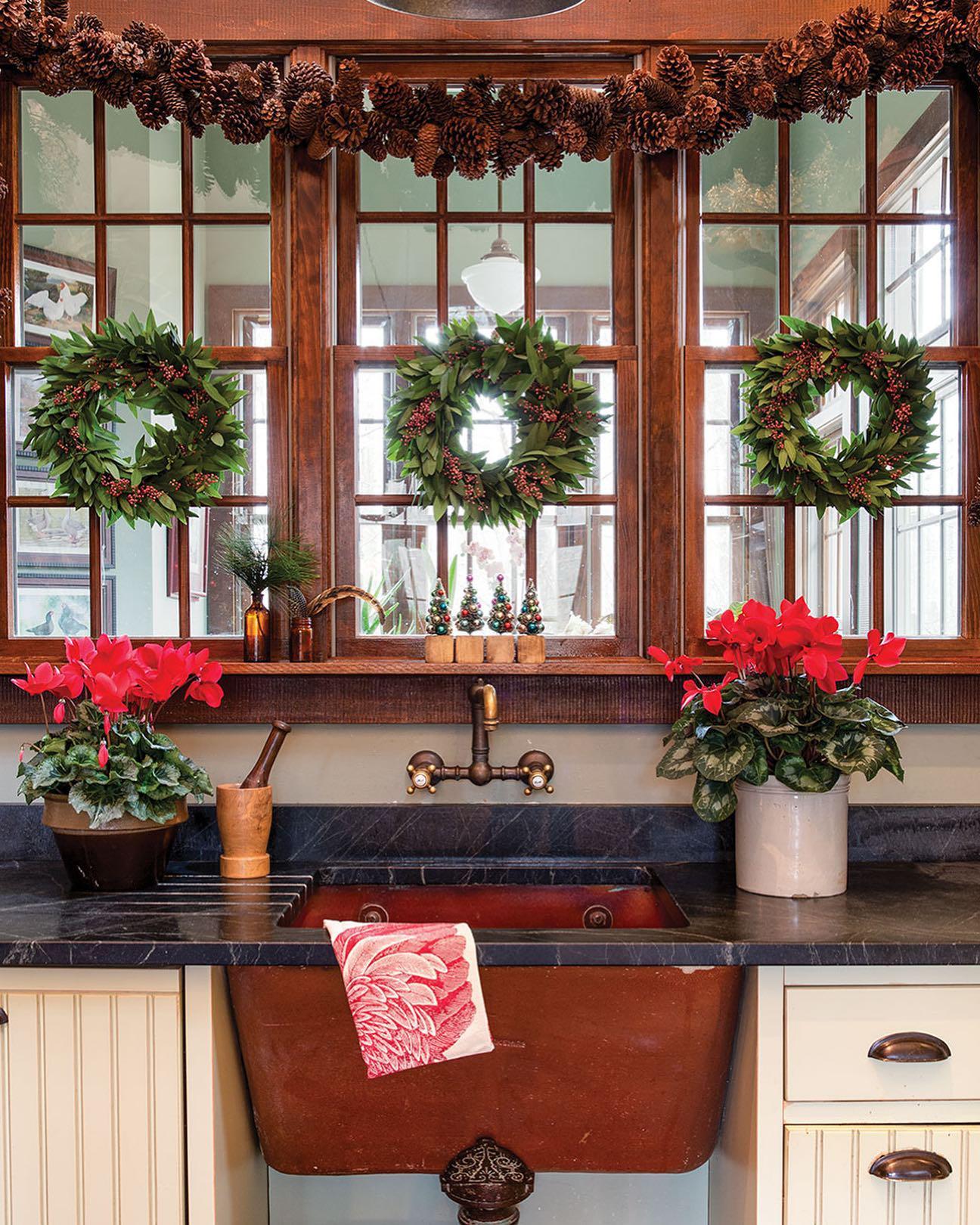 Decorating a kitchen window with garland brings a deligh ul mix of elegance and