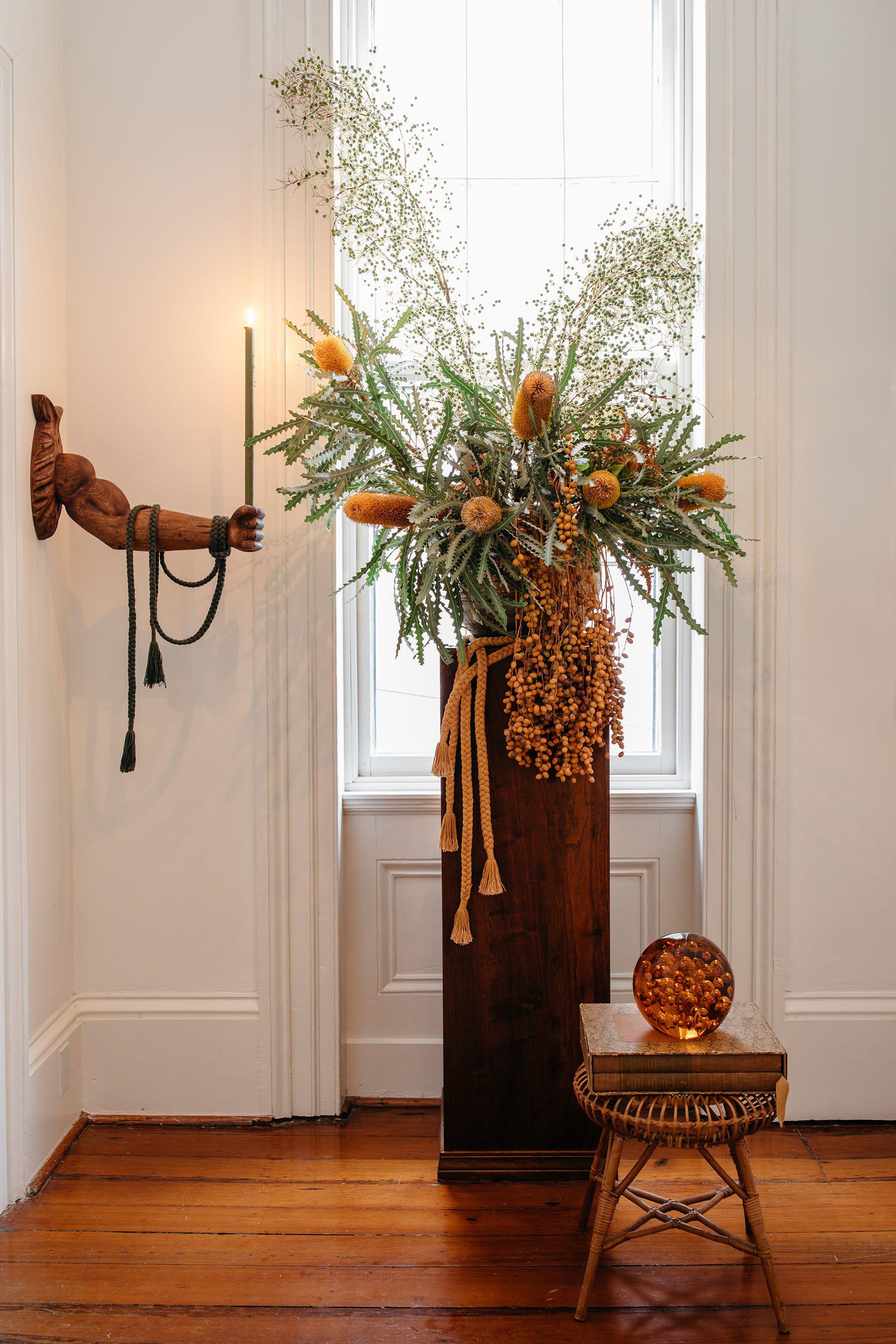 bouquet of orange florals. We’re loving the stately side sconce that seems to be in