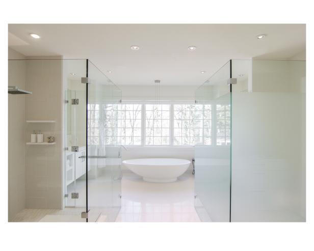 Many luxury freestanding tubs are paired with floor-mounted tub fillers, an elegant feature that may invite some extra splashes and spillage. These beautiful tubs and fillers aren't meant to be hidden, though, so a compromise is to include them in a wet room defined by simple, clean glass walls.