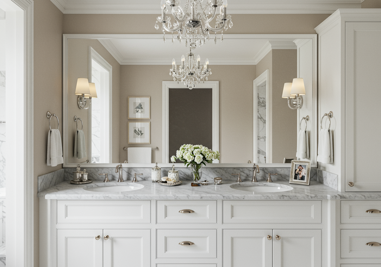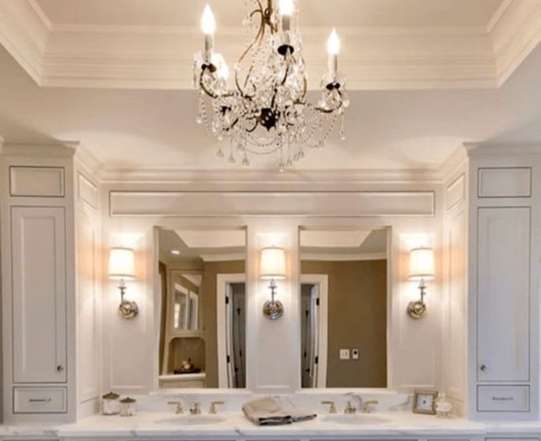 Lighting can be layered in the bath with task lighting—typically with vanity lights and an ambient, overhead fixture. Two of my favorite bath room lighting manufactures are Hudson Valley and Hinkley Lighting.