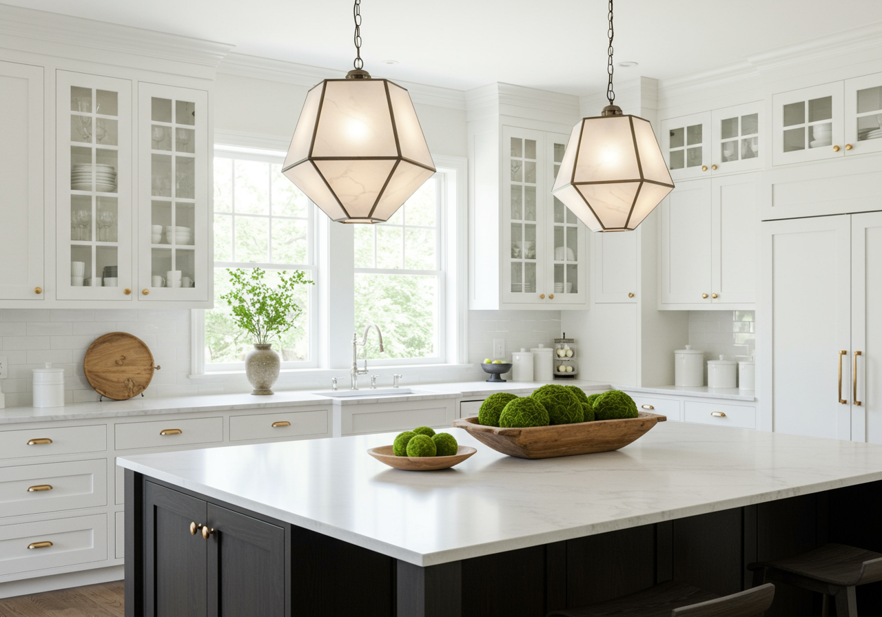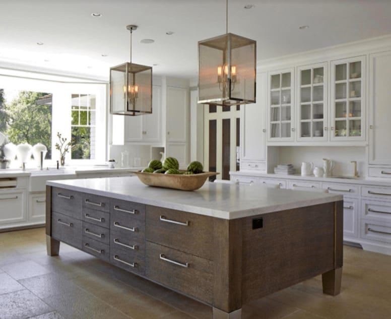 Finally, my favorite lights to select are kitchen/island pendants. This is the heart of the home and deserves great thought. When selecting pendants for the kitchen island, bigger is typically better. It is hard to picture an 8”X11” light in its intended environment for most people so make a template. When trying to decide what size light fits best, whether it is a grand dining room chandelier or mini kitchen pendants, tape pieces of cardboard or paper together that match the size you have selected. Hold it up in the location and step back to see how it lives in the location. More often than not, the light is too small. Balance is particularly important with regard to style, color, shape and size to bring the room over the finish line. Getting pendants right is not easy. Below are examples of kitchen pendants that I think hit a home run. Remember, this is a piece of jewelry and typically is a statement piece. Go for it!
