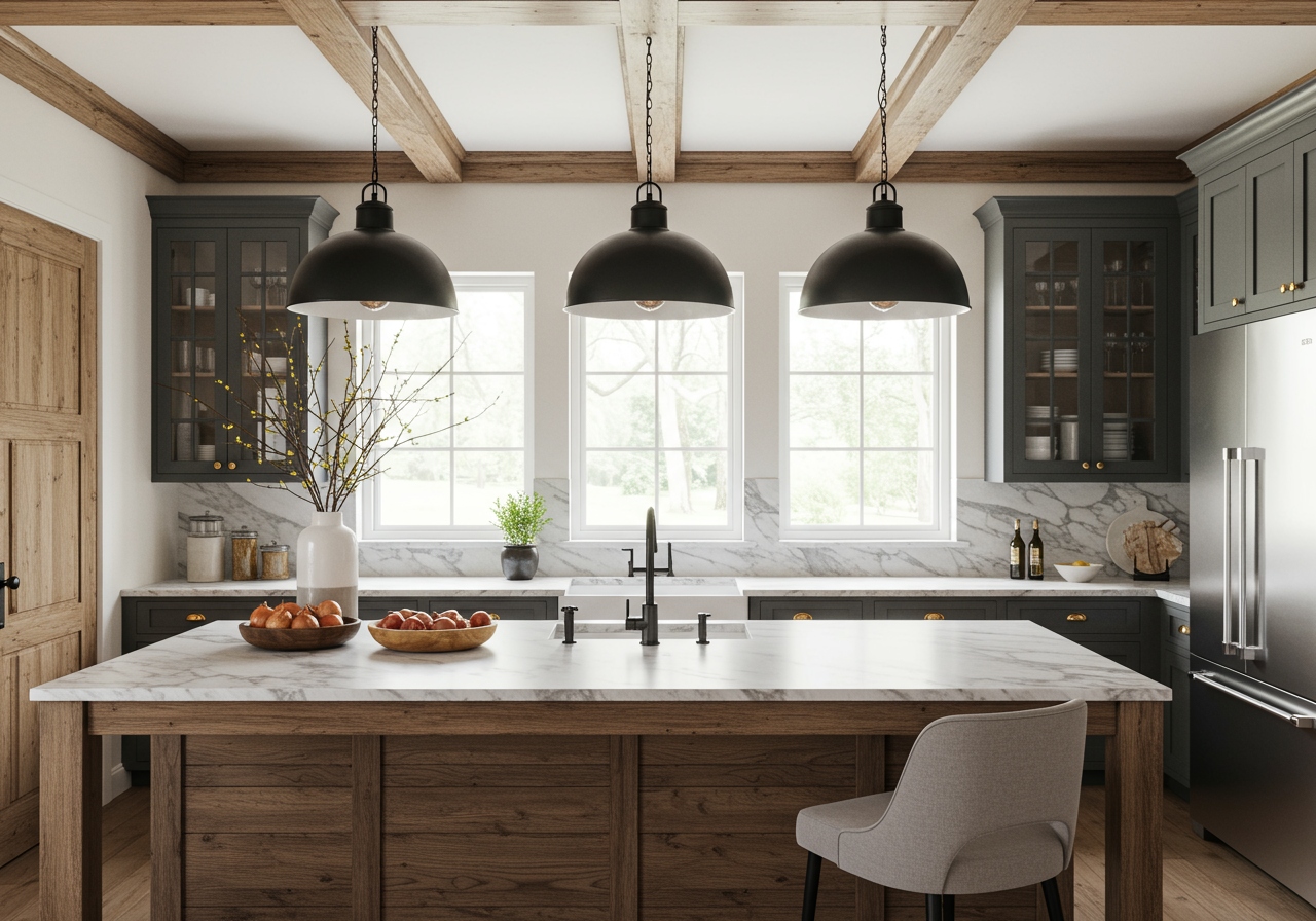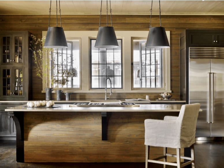 Love the color and shape of the pendant to match the square wood island. The pendants also match the hardware and balances the color throughout the kitchen. These pendants, like the island, are more transitional while the back cabinets are more traditional: Achieving a modern farmhouse look.