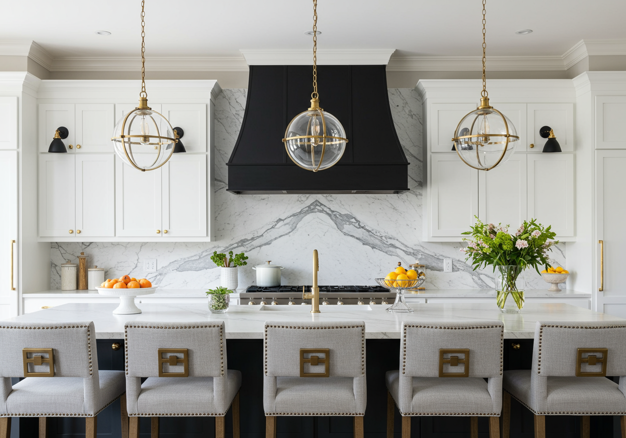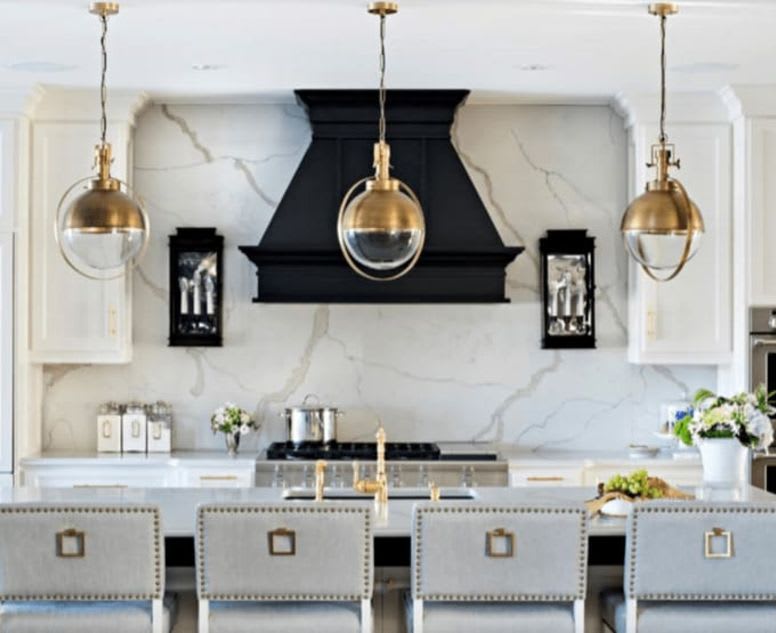 The brass lights are balanced out by the bar stool tacking as well as in the veins in the Calcutta marble, while the sconces bring the hood and range top/oven and island blacks together.