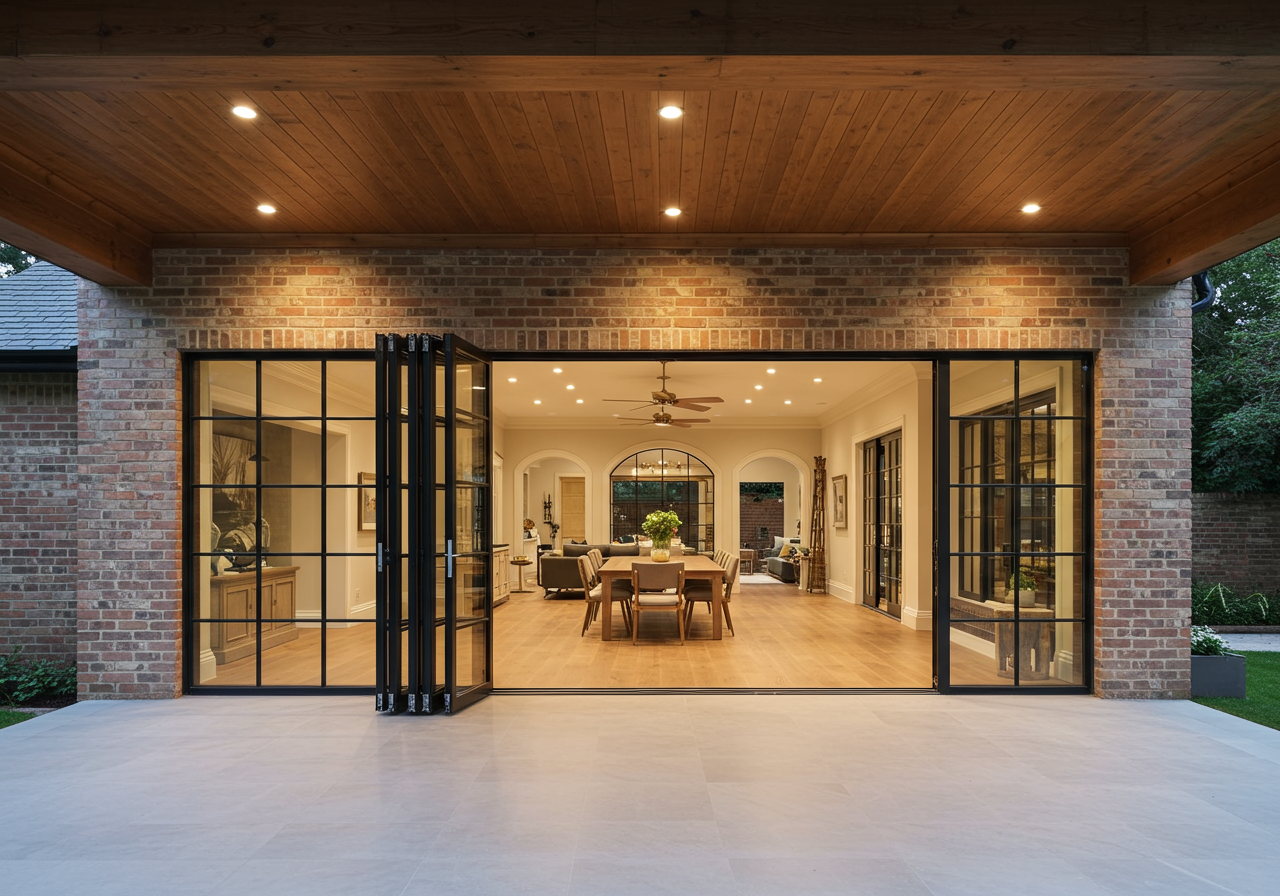 Some considerations need to be made as you choose between a sliding glass door or a bi-fold system. The load of the door can reach anywhere from 400 to 600 pounds in some cases, and with the bottom load of the sliding door, there’s a need to put locking inside to carry that weight. With a top-weighted bi-fold, the jamb will be larger to carry the load.
