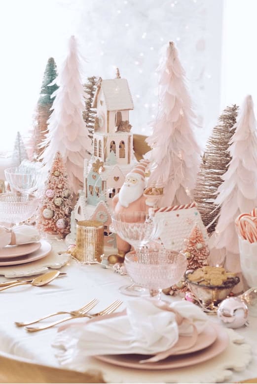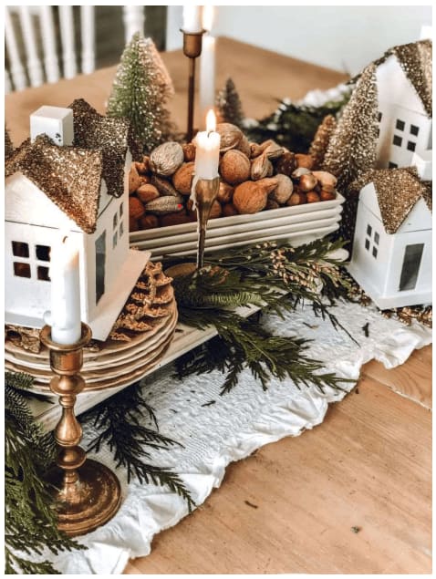 What’s more charming than eating over a mini-Christmas village? Eating over a mini-Christmas village with glitter accents. This table spread by Le Cultivateur’s Emily Traxler is a woodland scene gone glam in all the right ways. “I like to create spaces that feel magical and festive, yet warm and welcoming,” says Traxler. “This holiday table was loved by my family and my guests.”