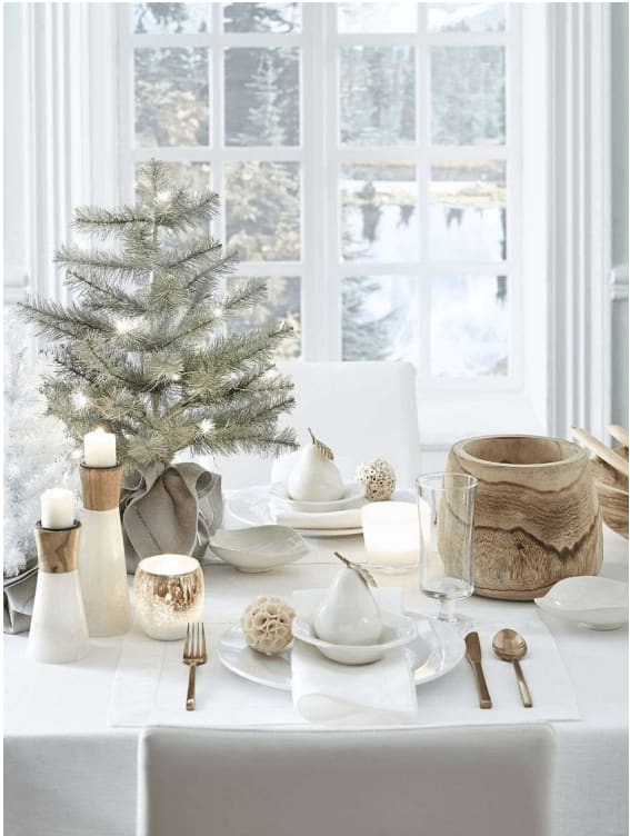Because one tree is never enough. Opt for a small table tree for a pop of color that works well against surrounding natural tableware. This spread, from SFERRA's Festival collection, takes its inspiration from a winter wonderland theme with a snow white palette that creates an elegant table any time of the year.