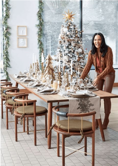 “Nothing gold can stay,” wrote the poet Robert Frost. He clearly never sat at Ayesha Curry’s holiday table, which is bedecked with glimmering carved Pottery Barn trees and matching candlesticks. The pairing, sitting atop a black-and-white botanical runner, is proof that it takes a lot of bling to overdose on sparkle. Curry’s advice? Contrast the gilded table adornments with fresh greenery beyond. “I love to incorporate natural greenery and lights throughout the house during the holidays,” she says. “Every room feels festive and smells amazing.”