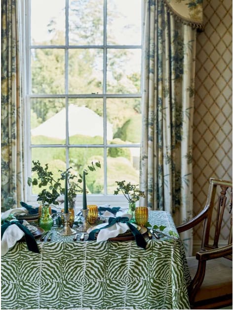 Forget the dream of a white Christmas and go for a safari-themed one with a palette that lends itself to almost any botanical centerpiece. Here, Preskett Mobbs brought in sprigs of tree branches to add texture to the silver-vesseled candlesticks and complementary-colored yellow glasses. “We love going for the unexpected with festive tables,” she explains.