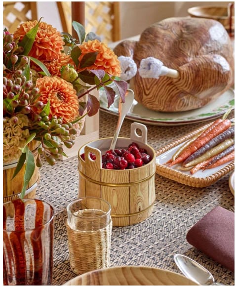 Here’s another winning tableau from Williams, who opted for a low-height arrangement that allows for easy eye contact. In this blue-toned dining room, a simple basket of seasonal fruits complements the corresponding green glassware. “Flowers are always nice, but for the holidays I like to use fruits and items from the yard to add texture and interest,” she explains. “The bright and unexpected pop of orange persimmons is not the traditional holiday color.” But it’s ever so lovely, all the same.