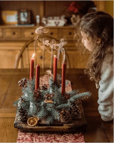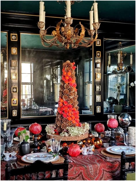 If there’s any group of people we can learn from when it comes to winter decor, it’s the Scandinavians, whose concept of coziness is imbued with warm textures, soft lighting, and time-honored traditions. This midwinter tabletop centerpiece is honing all the vibes of Saint Lucia’s Day, a candlelit procession on December 13 in which children don a crown of candles in a wreath atop their heads as a symbol of the bearer of light. A handful of dried oranges tops off this lovely assemblage for a look that is sure to spark a good conversation starter.