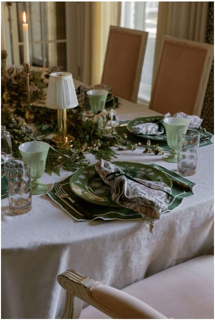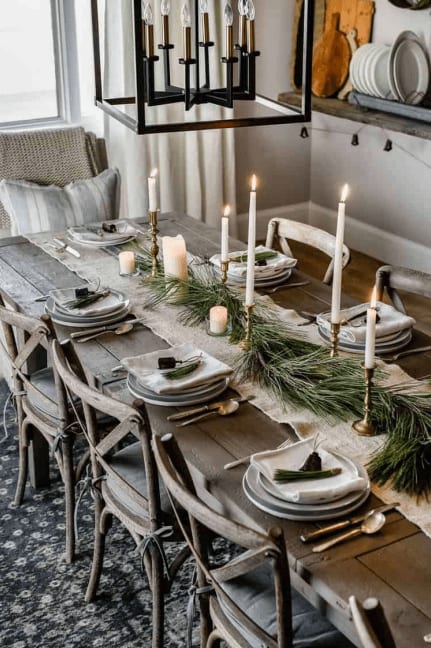 Sometimes you needn’t look further than your own backyard for the perfect dinner display. For this cozy farmhouse-style look, Boxwood Avenue’s Chloe Mackintosh used pine tree clippings and classic brass candlesticks. “When decorating for the holidays, I find myself turning to items I already own but using them in a new way,” she says. “When in doubt, something vintage always looks great.”