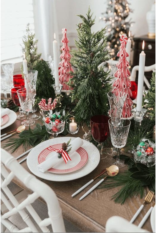 As for that centerpiece, Preskett Mobbs says the sky’s the limit. “Candy-cane glasses, jewel-toned candleholders, and silver goblets for berries are all lovely touches for a festive table.”