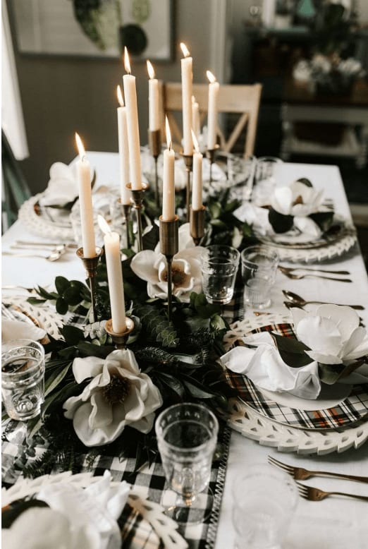 Poinsettias and holly are the plants of the season, but they run the risk of feeling a tad...predictable. To shake things up, pull inspiration from KBStyled and add some leafy greens and magnolia blossoms to your centerpiece.