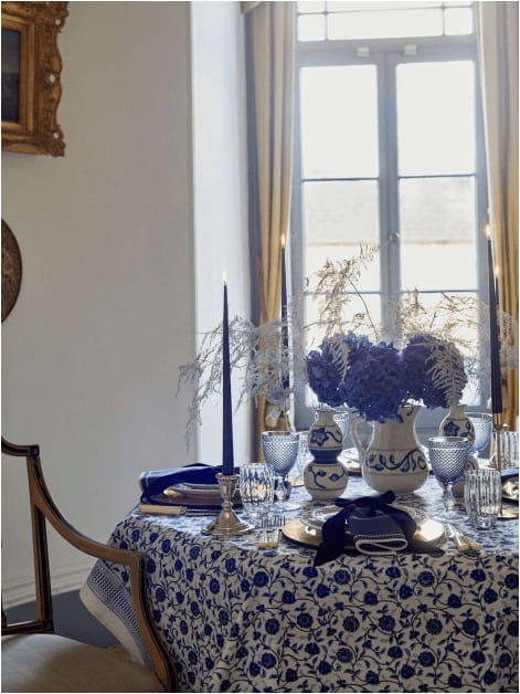 Whoever said having the blues was a bad thing? In this regal spread, a blue ceramic jar holds billowing hydrangeas that are layered with wispy white filler. The floral’s blue is further echoed in coordinating linens. “Match your napkins to your table linen for a beautiful pattern-on-pattern effect,” Preskett Mobbs explains. “Tie your napkins with velvet bows to make your table look and feel literally like a present for your guest. ’Tis the season for giving, after all!”