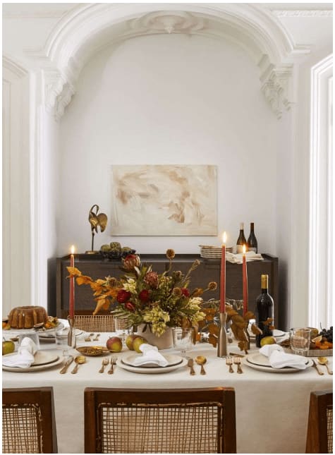 Set the stage for a turn-of-the season spread by basically bringing the pumpkin patch straight to your table. Here, Veronica Olson went for a warm-toned floral arrangement with matching candles and SFERRA linens. “We wanted to set the stage for those moments when time slows down and we truly engage with the people we cherish the most,” Olson says.