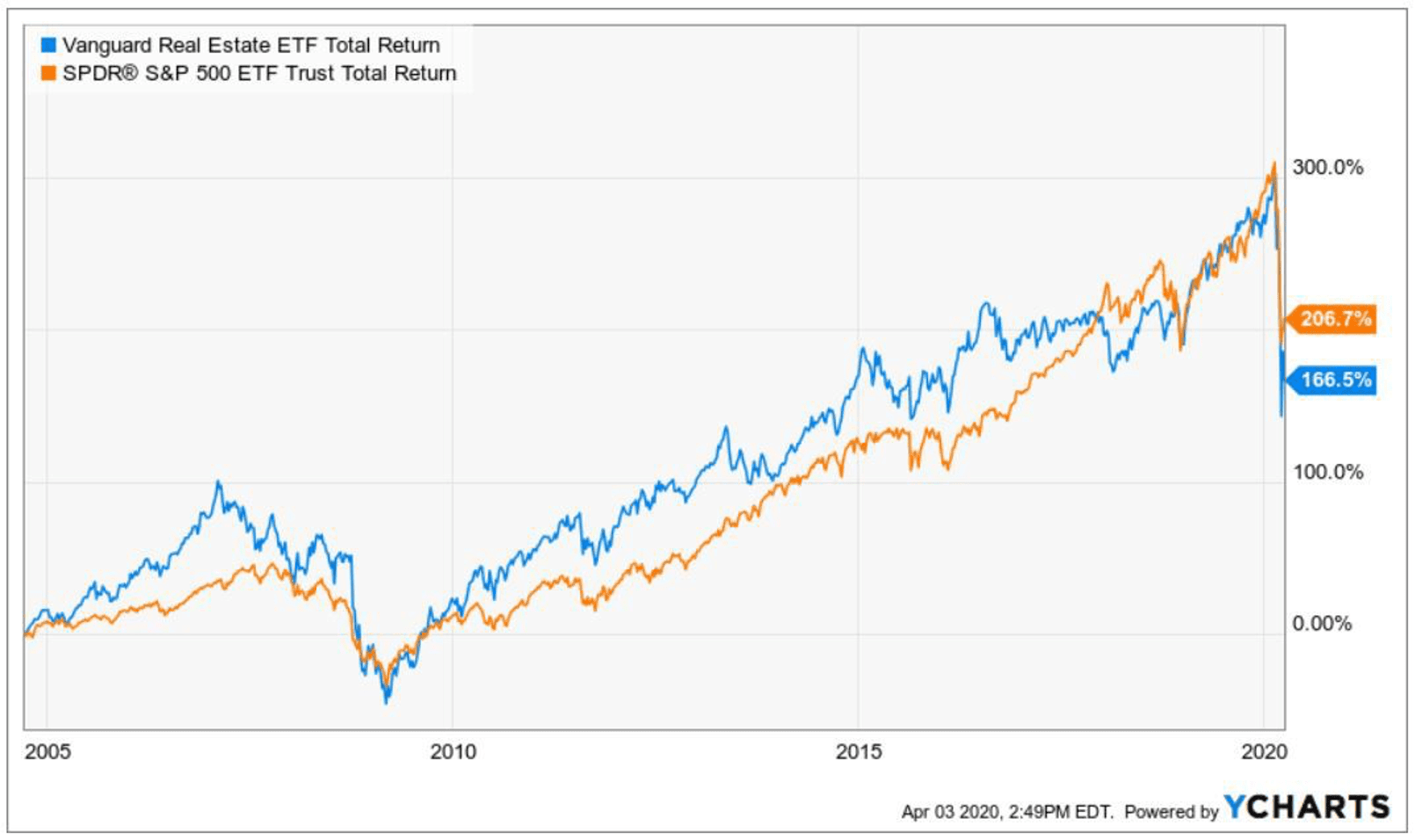 Comparing the returns of real estate and the stock market is an apples-to-oranges comparison—the factors that affect prices, values, and returns are very distinct. However, we can get a general idea by comparing the S&P 500 ETF Total Return (SPY) and the Vanguard Real Estate ETF Total Return (VNQ):