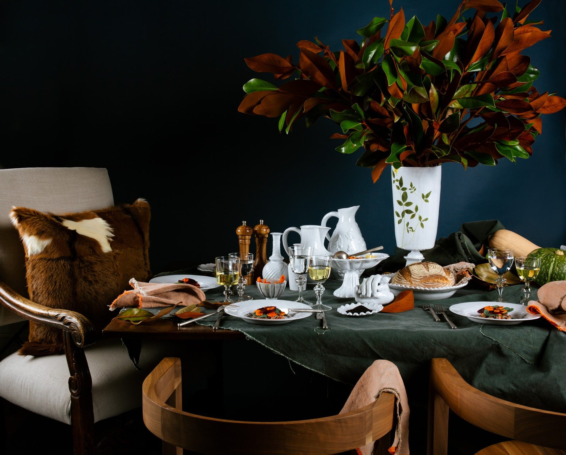 Monelle Totah the cofounder of home decor store Hudson Grace, likes to use a white tablecloth for the base, layering it with colorful linen accents to dress up the setting. “It can make a tablescape formal or informal with a switch of a color, adding texture and interest,” she says.