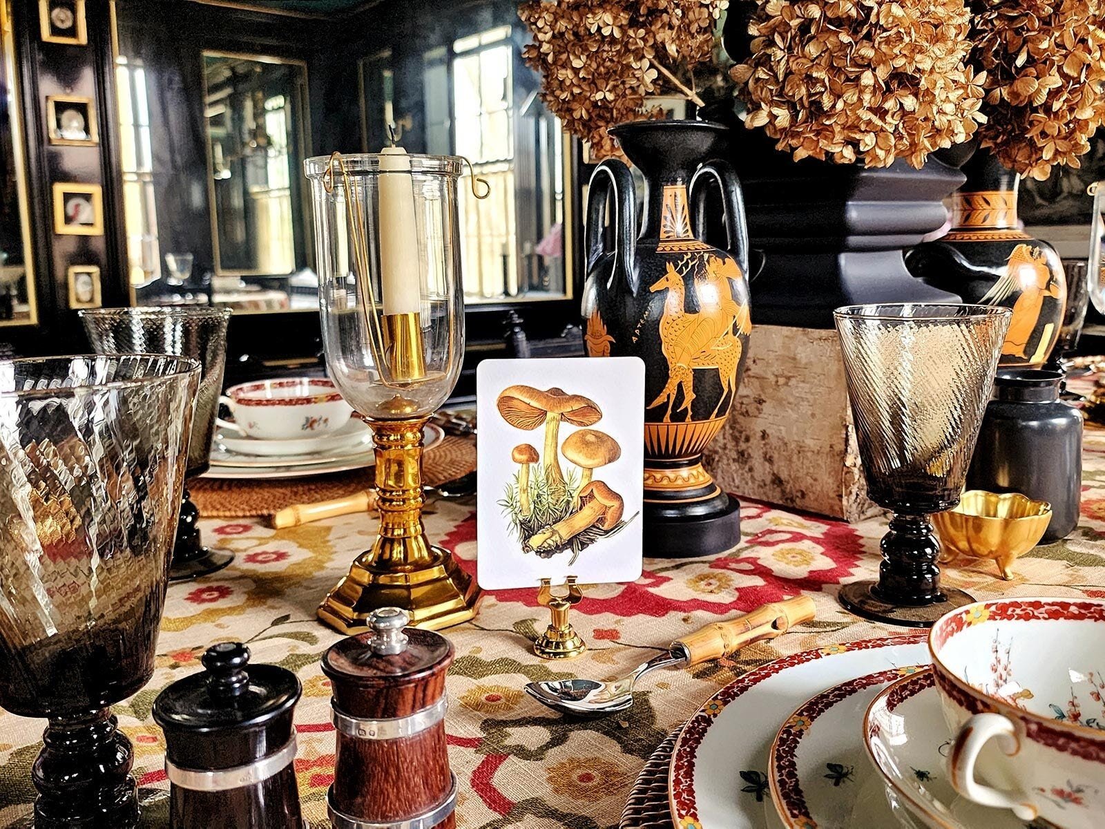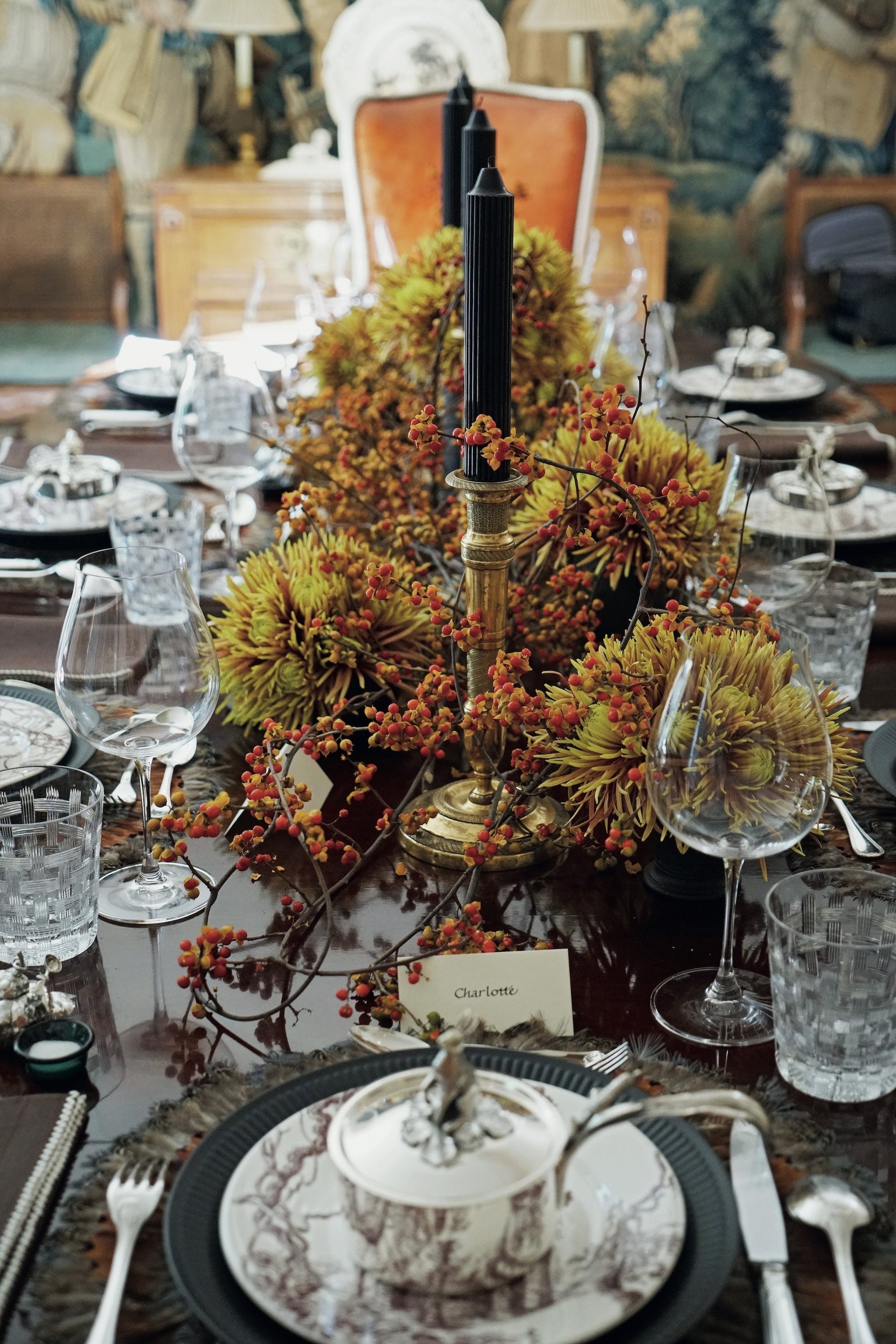 If Thanksgiving decorating is all Greek to you, go ahead and lean into it—literally. “Our design juxtaposes the classicism of the Greek vases with an earth-tone Suzani printed tablecloth, accentuating the richness of the season with reflective gold surfaces—hurricane lamps, salt and pepper cellars, and delicate bird figurines,” Martin Cooper, cofounder of the Punctilious Mr. P’s Place Card Co. explains of this opulent tablescape. “To complete the ensemble, we’ve included our own the Red Bands illustrated place cards, which bring a subtle yet striking visual harmony to the setting.”